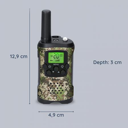 Walkie talkie με εμβέλεια έως και 7 km, σε χρώμα παραλλαγής.Απολαύστε τη διασκέδαση σε κάθε υπαίθρια δραστηριότητα με το Alecto FR115CAMO. Είτε βρίσκεστε σε κάμπινγκ, σαββατοκύριακα στη φύση, διακοπές ή απολαμβάνετε σπορ όπως snowboard, ψάρεμα, ορεινή ποδηλασία ή τρέξιμο αυτό το walkie-talkie είναι ο αξιόπιστος σύντροφος που χρειάζεστε.
