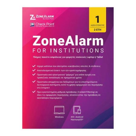 Antivirus ZoneAlarm Extreme Security for Institutions 1 Device, 2 Years. Η καλύτερη επιλογή για τη προστασία του υπολογιστή σας!. Η Ελληνική έκδοση του Zone Alarm for Institutions προστατεύει από κακόβουλους ιστότοπους και διατίθεται με αυτόματα προεγκατεστημένη την ρύθμιση πρόσβασης (URL filtering) σε όλες τις υποστηριζόμενες εφαρμογές περιήγησης (Edge, Chrome, Firefox) αποκλείοντας ακατάλληλο περιεχόμενο.