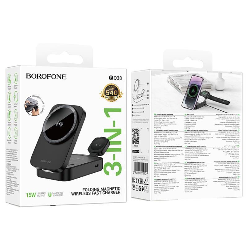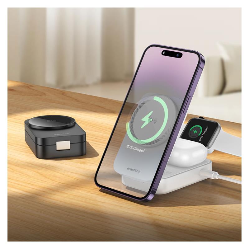 Η ασύρματη βάση Borofone BQ38 Sharp ξεχωρίζει ως κομψή, συμπαγής λύση που επιτρέπει ταυτόχρονη φόρτιση smartphone, ακουστικών και smartwatch. Με συμβατότητα MagSafe και USB C είσοδο για γρήγορη φόρτιση, ενσωματώνει λειτουργικότητα, minimal design και φορητότητα.