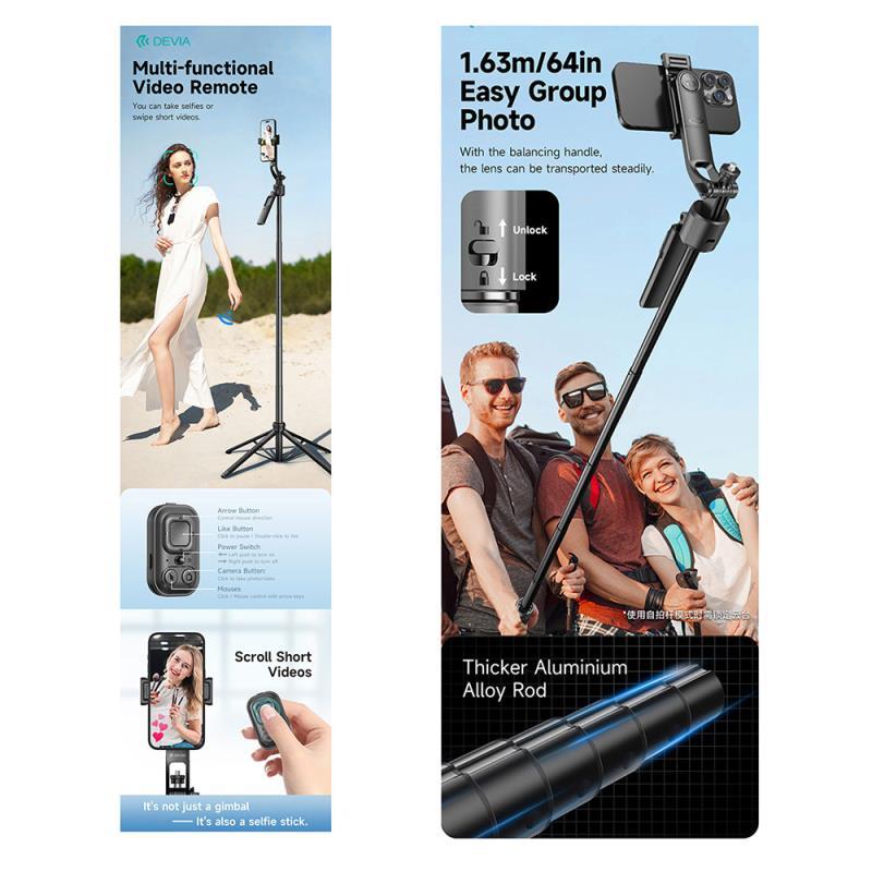 Το Devia ES086 C17 Wireless Selfie Stick & Tripod είναι ένα ευέλικτο εργαλείο για τη λήψη τέλειων φωτογραφιών και βίντεο. Διαθέτοντας AI Face Tracking, ακολουθεί αυτόματα τις κινήσεις σας για εγγραφή χωρίς χέρια, ιδανική για vlogs, live μεταδόσεις βίντεο και ομαδικές λήψεις. Ο ελαφρύς, πτυσσόμενος σχεδιασμός του μεταμορφώνεται εύκολα από selfie stick σε σταθερό τρίποδο. Με συνδεσιμότητα Bluetooth, μπορείτε να ελέγχετε από απόσταση το smartphone σας για λήψεις χωρίς κόπο. Συμβατό με τα περισσότερα smartphones, το Devia ES086 C17 εξασφαλίζει ομαλές, υψηλής ποιότητας λήψεις κάθε φορά. Ανεβάστε τη δημιουργία περιεχομένου στο επόμενο επίπεδο με αυτό το έξυπνο, πολυλειτουργικό αξεσουάρ!