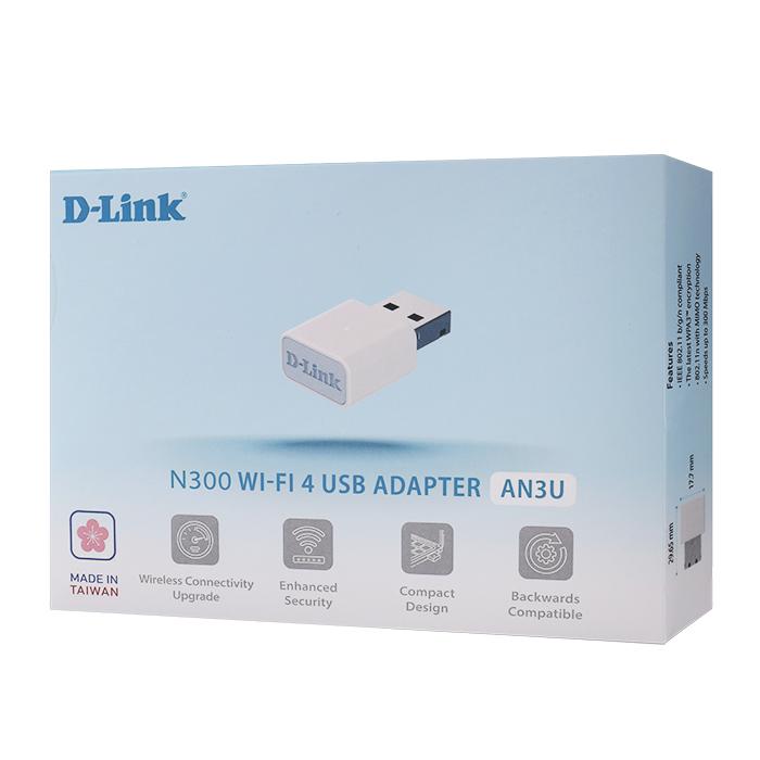 N300 Wi-Fi 4 USB adapter.Σας παρουσιάζουμε το νέο USB 2.0 ασύρματο αντάπτορα AN3U της D-Link, σχεδιασμένο για να ενισχύει άμεσα τις επιδόσεις Wi-Fi του υπολογιστή ή του laptop σας. Η λειτουργία Plug & play σας επιτρέπει να απολαμβάνετε γρήγορες και σταθερές συνδέσεις στο σπίτι, στο γραφείο ή εν κινήσει. Ιδανικός για sreaming, εργασία εξ αποστάσεως, on line gaming ή καθημερινή πλοήγηση. Αναβαθμίστε την ασύρματη συνδεσιμότητα σας Ο AN3U USB αντάπτορας υποστηρίζει τεχνολογία Wi-Fi 4, αναβαθμίζοντας την ασύρματη σύνδεσή σας με ταχύτητες έως και 300 Mbps. Εξασφαλίζει αξιόπιστη περιήγηση στο διαδίκτυο, HD streaming και ομαλό on line gaming.Προσφέρει εξαιρετικές επιδόσεις ως μια οικονομική λύση για να συνδεθείτε στο διαδίκτυο.Ενσωματωμένη προηγμένη ασφάλειαΜε την υποστήριξη του νεότερου πρωτοκόλλου WPA3, τα προσωπικά σας δεδομένα παραμένουν προστατευμένα και η σύνδεσή σας ασφαλή. Εργαστείτε περιηγηθείτε και κάντε streaming - όπου και αν βρίσκεστε.Απλή εγκατάσταση, πλήρης συμβατότηταΜε την ευκολία Plug and Play, η εγκατάσταση ολοκληρώνετε πολύ γρήγορα. Με τον μικροσκοπικό σχεδιασμό του χωράει παντού, ενώ η συμβατότητα με παλαιότερες εκδόσεις εξασφαλίζει ομαλή λειτουργία σε κάθε Wi-Fi router or gateway. Τεχνικές προδιαγραφέςΓενικά:- Ασφάλεια: Προστατευμένη πρόσβαση Wi-Fi (WPA2 και WPA3)- Πρότυπα: IEEE 802.11b/g/n- Τύπος κεραίας: 2x Εσωτερικές κεραίεςΑπαιτήσεις- Λειτουργικό σύστημα: Windows 10/11, Υποστήριξη 32 & 64-bit driver- Διεπαφή: Διαθέσιμη θύρα USB 2.0Φυσικά χαρακτηριστικά- Διαστάσεις: 29.65 x 17.7 x 9.7 mm- Βάρος: 4.16 g- Ισχύς: Τάση λειτουργίας: 5.0 VDC ± 10%- Κατανάλωση ισχύος: Λειτουργία: 330 mA / Αναμονή: 220 mA- Θερμοκρασία: Λειτουργία: 0 έως 40°C (32 έως 104°F), Αποθήκευση: -20 έως 75°C (-4 έως 167°F)- Υγρασία: Λειτουργία: 10% έως 90% (χωρίς συμπύκνωση) , Αποθήκευση: 5% έως 95% (χωρίς συμπύκνωση)- Πιστοποιήσεις: FCC Class B, CE, IC