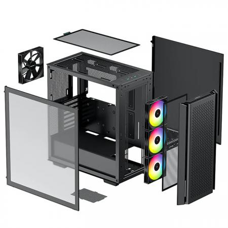 Κουτί DEEPCOOL CG560 για μητρικές Mini ITX / Micro ATX / ATX και E-ATX.Το CG560 είναι ένα εξαιρετικά ποιοτικό και λειτουργικό midi κουτί, με σύγχρονο σχεδιασμό και ιδιαίτερα χαρακτηριστικά όπως σύστημα φωτισμού RGΒ, εντυπωσιακό full size γυάλινο πλαϊνό και διάτρητη μπροστινή όψη με pattern που ευνοεί την ανεμπόδιστη είσοδο αέρα και εξαιρετική ικανότητα ψύξης χάρη στους τέσσερις προεγκατεστημένους ανεμιστήρες. Το πλαϊνό γυάλινο παράθυρο, προσφέρει μοναδική εμφάνιση στο PC σας και άριστη θέα στο εσωτερικό του. Επίσης το το CG560 Mid Tower προσφέρει μοντέρνα brutalist εμφάνιση με το ξεχωριστό διάτρητο μπροστινό πάνελ με μοτίβο “hair pattern”, ενώ διαθέτει και αποσπώμενο φίλτρο στο μπροστινό μέρος.Το CG560 έχει 3 προεγκατεστημένους ανεμιστήρες ARGB 120mm στο μπροστινό μέρος που ελέγχονται εύκολα χειροκίνητα με το πλήκτρο στο μπροστινό πάνελ ή από την μητρική, οι οποίοι παρέχουν μοναδικά εφέ φωτισμού. Επιπλέον διαθέτει 1 ανεμιστήρα 140mm σε μαύρο χρώμα στο πίσω μέρος για μέγιστη ροή αέρα! Το φίλτρο στο επάνω μέρος είναι μαγνητικό και αποσπώμενο για εύκολο καθάρισμα και διακριτική εμφάνιση.Επίσης, το CG560 διαθέτει θύρες 2x USB3.0, εισόδους Audio(HD) / Mic και πλήκτρα LED για χειρισμό του φωτισμού, και Ι/Ο στο πάνω panel.Υποστηρίζει την εγκατάσταση συστήματος υδρόψυξης:- 120/140/240/280mm στο επάνω μέρος- 120/140mm στο πίσω μέρος- 120/140/240/280/360mm στο μπροστινό μέροςΥποστηρίζει την εγκατάσταση ανεμιστήρων:- 2x120 / 2x140mm στο επάνω μέρος- 1x120 / 1x140mm στο πίσω μέρος- 3x120 / 2x140mm στο μπροστινό μέροςΕπίσης μπορείτε να εγκαταστήστε έως και 2x 2.5” SSD απευθείας στο πίσω μέρος και 2x 3.5” HDD στο κάτω μέρος δίπλα από το τροφοδοτικό, για να έχετε όχι μόνο άφθονο χώρο αποθήκευσης αλλά και διακριτικά τοποθετημένο.Το CG560 είναι εξοπλισμένο με ξεχωριστό, καλυμμένο τμήμα για το PSU για να διατηρεί τα καλώδια τακτοποιημένα και το εσωτερικό του κουτιού με αψεγάδιαστη εμφάνιση.Τέλος το CG560 έχει και Rubber Grommets στα εσωτερικά ανοίγματα για μεγαλύτερη άνεση και ασφάλεια κατά την συναρμολόγηση του PC.Προδιαγραφές κουτιού:- Μητρικές: Mini-ITX / Micro-ATX / ATX / E-ATX- Τύπος: ATX Case- Υλικά κατασκευής: ABS+SPCC+Tempered Glass- Διαστάσεις προϊόντος (MxΠxΥ): 455x230x470mm- Καθαρό βάρος: 7.5kg- 3.5 " drive bays: 2- 2.5 " drive bays: 2 + 1- I/O Panel: Audio x 1,USB3.0 x 2- Θύρες επέκτασης: 7- Τύπος τροφοδοτικού: ATX PS2 (με μήκος έως 160mm)- Μέγιστο ύψος CPU Cooler: 175mm- Μέγιστο μήκος VGA: 380mm- Προεγκατεστημένοι ανεμιστήρες: 3x 120mm ARGB στο μπροστά μέρος, 1x 140mm black στο πίσω μέροςΠροαιρετικά: Μπροστά: 3x 120mm/2x140mm, Επάνω μέρος: 2x120/2x140mm, Πίσω μέρος: 1x120/1x140mm- Υποστήριξη Υδρόψυξης: Μπροστά: 120/140/240/280/360mm, Επάνω μέρος: 120/140/240/280mm, Πίσω: 120/140mm