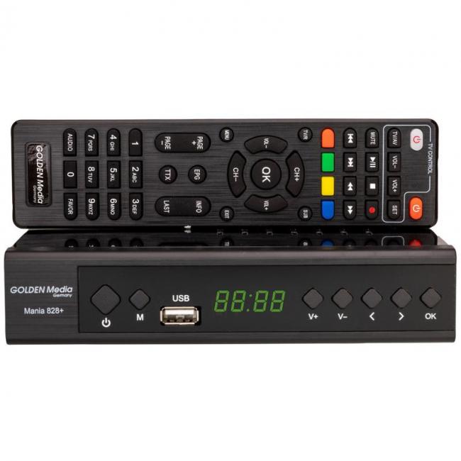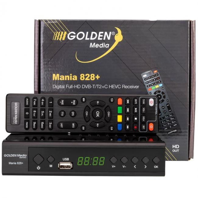 Επίγειος ψηφιακός δέκτης MPEG 4 Golden Media Mania 828+ με τηλεχειριστήριο learning. Υβριδικός δέκτης νέας γενιάς που υποστηρίζει λήψη επίγειων και καλωδιακών καναλιών (DVB-T/T2 & DVB-C) με υποστήριξη συμπίεσης H.265 HEVC και ανάλυση Full HD 1080p. Διαθέτει θύρες USB για εγγραφή και αναπαραγωγή πολυμέσων, καθώς και δυνατότητα σύνδεσης στο διαδίκτυο μέσω Ethernet ή WiFi (μέσω USB). Προσφέρει εύχρηστο περιβάλλον με πολυγλωσσικό μενού, ηλεκτρονικό οδηγό προγράμματος και γρήγορη πλοήγηση καναλιών, ενώ η ενσωματωμένη οθόνη και το τηλεχειριστήριο learning προσφέρουν επιπλέον ευκολία στη χρήση.