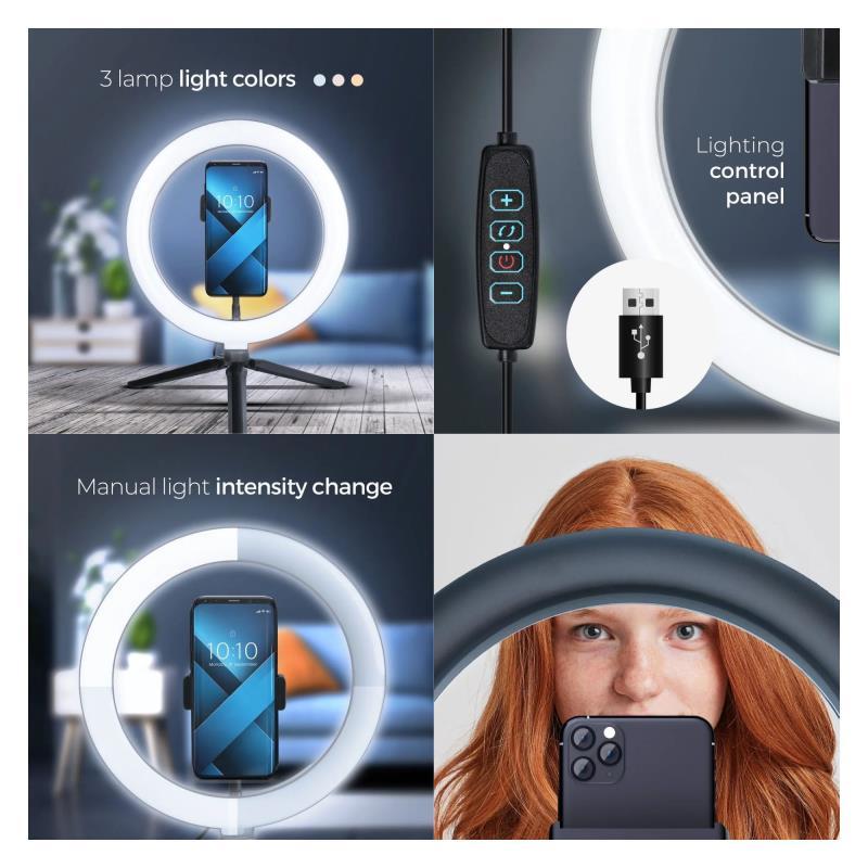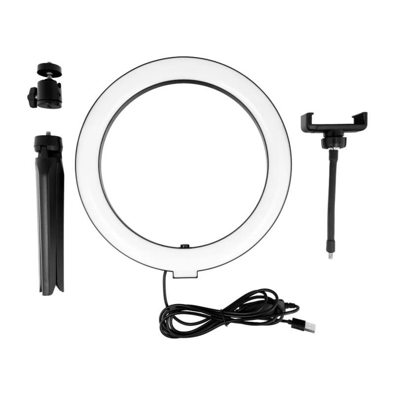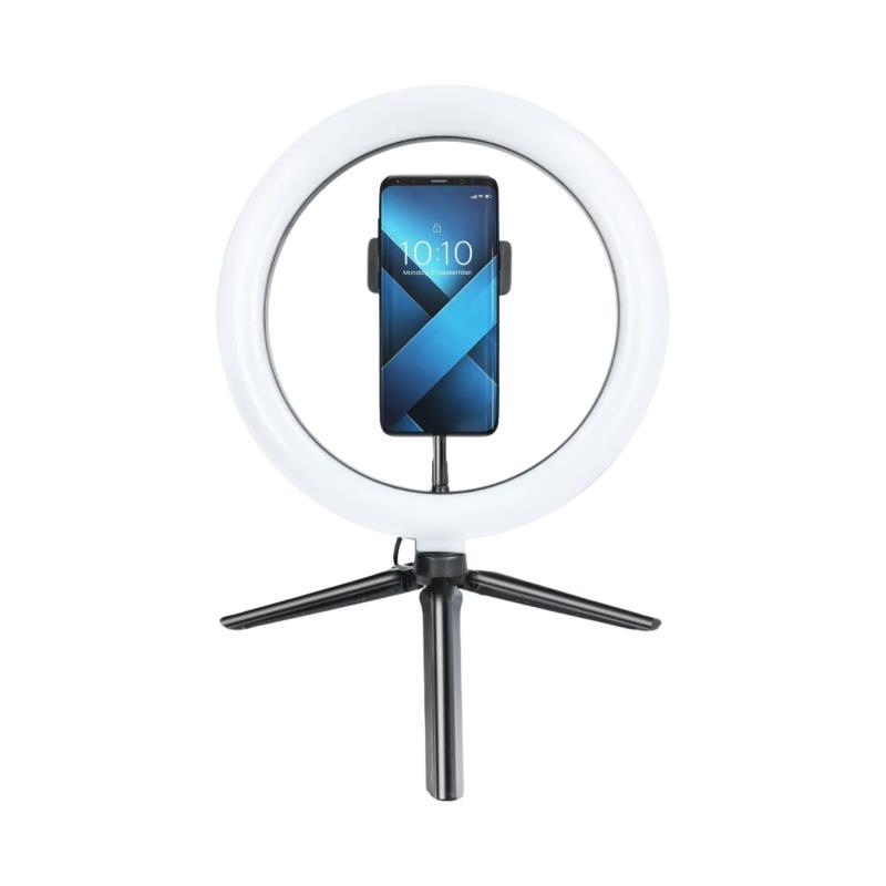 Ιδανική λύση για livestreaming, vlogging, ή απλές βιντεοκλήσεις, το τρίποδο με δακτυλιοειδή LED λάμπα 10" προσφέρει σταθερό φωτισμό με εφέ RGB για επαγγελματικό αποτέλεσμα. Ρυθμιζόμενο ύψος και γωνία, εύκολο στη χρήση σε γραφείο, με βάση για smartphone και σύνδεση μέσω USB.
