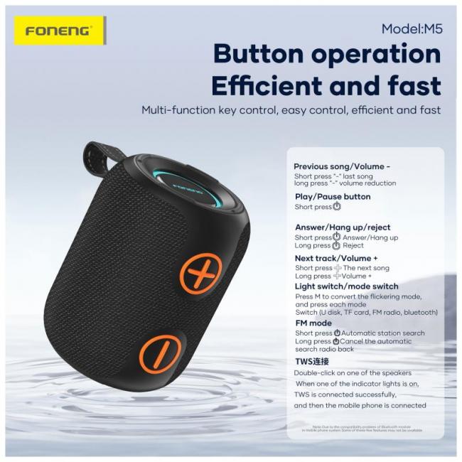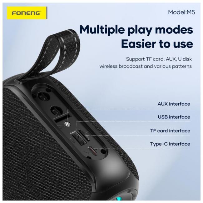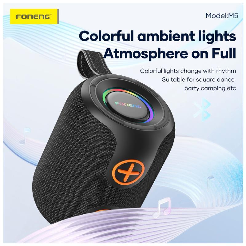 Το φορητό ηχείο Bluetooth Foneng M5 Deep Bass Colorful συνδυάζει ισχυρό ήχο, μοντέρνο σχεδιασμό και πρακτικότητα, αποτελώντας ιδανική επιλογή για καθημερινή μουσική. Με ισχύ 8W, προσφέρει καθαρό και γεμάτο ήχο, ενώ η τεχνολογία Deep Bass ενισχύει τις χαμηλές συχνότητες για πιο δυναμική ακουστική εμπειρία. Επίσης, προσφέρει ικανοποιητική αυτονομία, επιτρέποντάς σας να απολαμβάνετε τη μουσική σας όπου κι αν βρίσκεστε. Το πολύχρωμο φωτιστικό εφέ προσθέτει μια μοντέρνα πινελιά που κάνει το ηχείο να ξεχωρίζει.