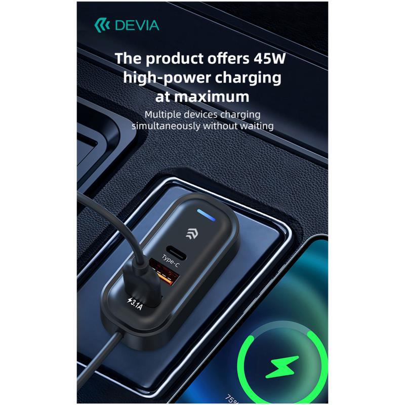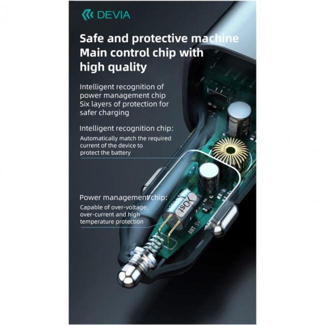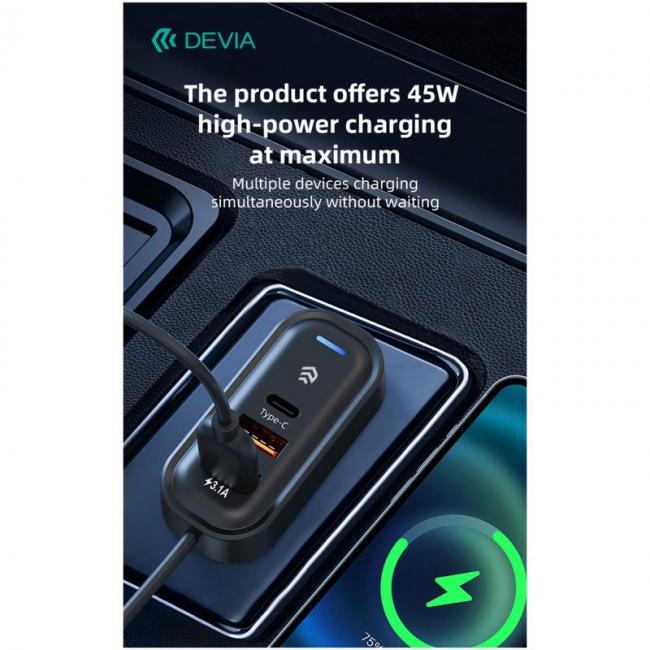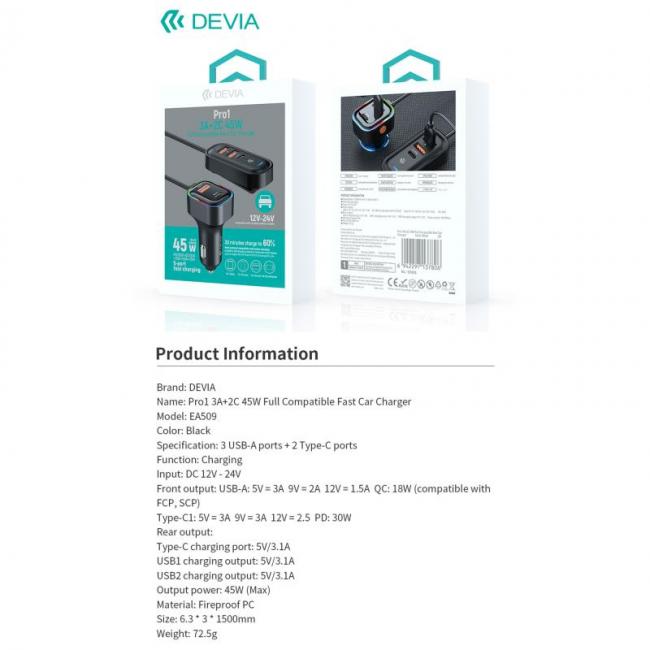 Ο Devia K5 45W Pro1 είναι η απόλυτη λύση για όσους θέλουν γρήγορη, σταθερή και ταυτόχρονη φόρτιση έως 5 συσκευών μέσα στο αυτοκίνητο. Με 3 θύρες USB A και 2 θύρες USB C, προσφέρει συνολική ισχύ 45W, υποστηρίζοντας τεχνολογίες PD 30W, QC 18W, FCP και SP για μέγιστη συμβατότητα με κάθε φορητή συσκευή. Με έξυπνη κατανομή ισχύος και σταθερή απόδοση, φορτίζει γρήγορα χωρίς υπερθέρμανση, ενώ το ανθεκτικό, πυρίμαχο υλικό PC εξασφαλίζει ασφάλεια και αντοχή στη θερμότητα. . Παρά την υψηλή ισχύ του, παραμένει συμπαγής και ελαφρύς, με μήκος καλωδίου 1.5m για άνετη χρήση.