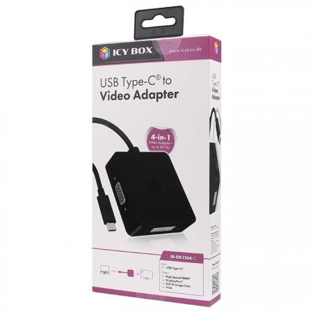 Σταθμός σύνδεσης από USB Type-C σε DisplayPort, HDMI, DVI-D ή VGA, με ενσωματωμένο καλώδιο 0.15m.Το IB-DK1104-C είναι ιδανικό για τη σύνδεση μιας τηλεόρασης ή οθόνης ή ενός προτζέκτορα, με είσοδο είτε HDMI ή DisplayPort ή DVI-D ή VGA, με το laptop σας που διαθέτει έξοδο USB Type-C και υποστήριξη DisplayPort Alt Mode. Υποστηρίζει επίσης λειτουργία κατοπτρισμού ή επέκτασης βίντεο για μία οθόνη και ανάλυση έως και 3840x2160@60 Hz. Συνδεδεμένος σε οθόνη HDMI ή DisplayPort, ο αντάπτορας μπορεί να μεταδώσει τόσο το σήμα βίντεο όσο και το σήμα ήχου, χωρίς να απαιτείται επιπλέον καλώδιο ήχου.Χαρακτηριστικά:Βασικά χαρακτηριστικά:- Συμπαγής σχεδιασμός, που υποστηρίζει προβολή μέσω σύνδεσης HDMI ή DisplayPort ή DVI-D ή VGA- Plug & Play- Δεν απαιτείται εγκατάσταση επιπλέον drivers- Διαθέτει ενσωματωμένο καλώδιο USB Type-C, μήκους 15 cm- Σύνδεση: USB 3.2 (Gen 2) Type-C- Συνδέσεις συσκευών: 1x DisplayPort, 1x HDMI, 1x DVI-D, 1x VGA θηλ.- Υποστηρίζει αναλύσεις: DisplayPort 1.2 έως 3840x2160@60 Hz, VGA έως 1920x1080@60 Hz, HDMI έως 3840x2160@60 Hz, DVI-D έως 1920x1200@60 Hz- Υποστηρίζει υπολογιστές με θύρα USB Type-C και προδιαγραφές DisplayPort Alt Mode- Επιτρέπει τη συνέχιση της δουλειά σε άλλη οθόνη μέσω της λειτουργία αντικατοπτρισμού ή επέκτασης- Τροφοδοσία μέσω του καλωδίου σύνδεσης- Απαιτήσεις συστήματος: Απαιτείται υποστήριξη DisplayPort Alt Mode. Η συσκευή πρέπει να είναι συμβατή με υπολογιστές εξοπλισμένους με Thunderbolt 3 / 4- Υλικό: Πλαστικό- Χρώμα: ΜαύροΣυμβατότητα: Windows, macOS, Chrome OSΠεριεχόμενο συσκευασίας:- 1x IB-DK1104-C- 1x Εγχειρίδιο χρήσης