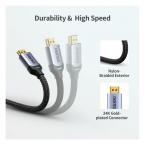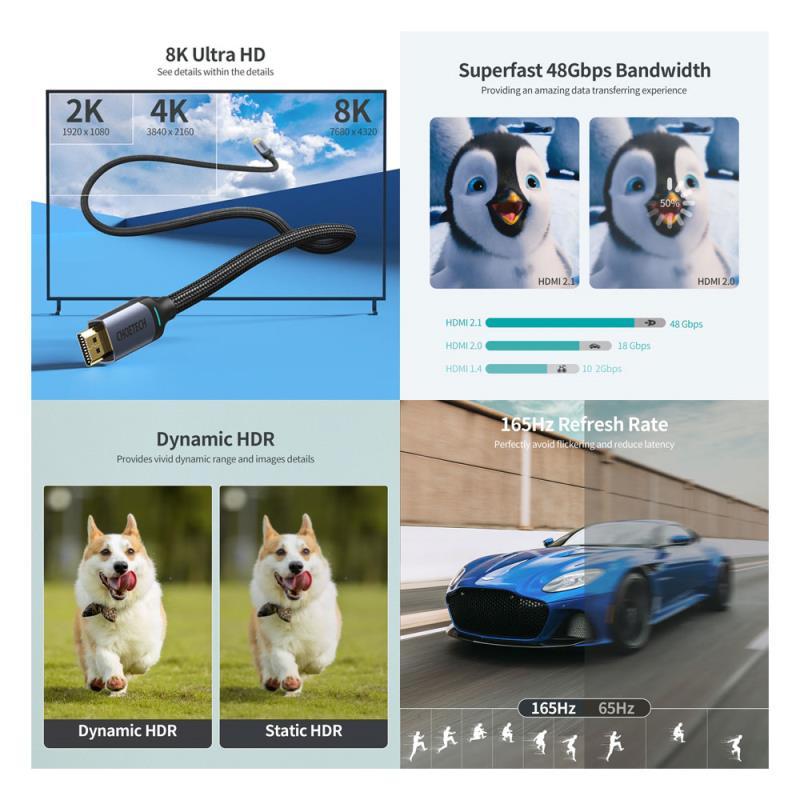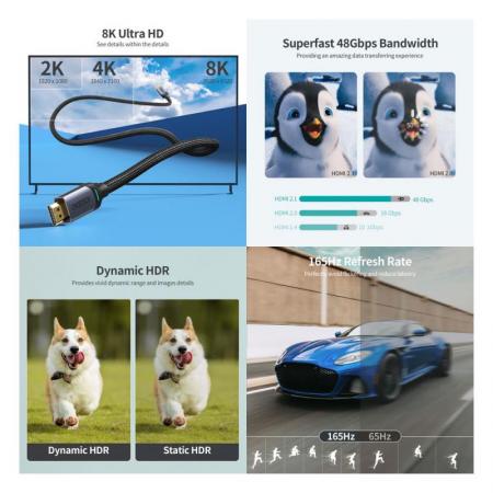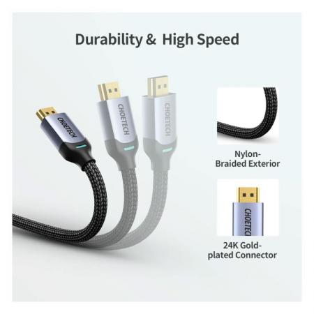 Το καλώδιο Choetech XHH01 HDMI σε HDMI υποστηρίζει ανάλυση 8K 60Hz και παρέχει εύρος ζώνης έως και 48Gbps. Ξεχωρίζει επίσης για την ευρεία συμβατότητά του και την υποστήριξη λειτουργιών όπως Dynamic HDR, 3D και Quick Media Switching. Είναι εξοπλισμένο με νάιλον πλέγμα που το προστατεύει από φθορές και είναι επίσης ανθεκτικό στο λύγισμα και το τράβηγμα. Οι επιχρυσωμένες υποδοχές του είναι απίστευτα ανθεκτικές και παρέχουν γρήγορη και αξιόπιστη μετάδοση.