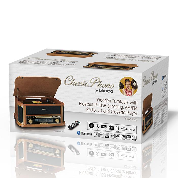 Πικάπ σε ρετρό σχεδιασμό με ενσωματωμένα ηχεία 10W, Bluetooth, ραδιόφωνο AM/FM, CD player, κασετόφωνο και λειτουργία μετατροπής MP3.Το Classic Phono TCD-2551WD της Lenco είναι κάτι περισσότερο από ένα πικάπ – είναι ένα πλήρες, all-in-one μουσικό σύστημα που συνδυάζει τη νοσταλγία του παρελθόντος με τις τεχνολογικές απαιτήσεις του σήμερα. Με κομψή ξύλινη κατασκευή από MDF και vintage σχεδιασμό, ταιριάζει ιδανικά σε κάθε χώρο, προσφέροντας παράλληλα σύγχρονες δυνατότητες για μια πλήρη εμπειρία ακρόασης.Στο επίκεντρο βρίσκεται το πικάπ με ιμάντα, που προσφέρει σταθερή και καθαρή αναπαραγωγή βινυλίων σε τρεις ταχύτητες (33, 45 και 78 στροφές). Χάρη στον μεταλλικό μεντεσέ, μπορείτε να αναπαράγεται δίσκους με ανοιχτό ή κλειστό καπάκι, ενώ η δυνατότητα εγγραφής μέσω USB επιτρέπει τη μετατροπή των αγαπημένων σας κομματιών σε MP3, απευθείας από βινύλιο, CD, ραδιόφωνο, Bluetooth ή line-in.Εκτός από βινύλια, μπορείτε να απολαύσετε CD, κασέτες, ραδιόφωνο AM/FM ή να μεταδώσετε τα αγαπημένα σας κομμάτια ασύρματα από το κινητό ή το tablet σας μέσω της τεχνολογίας Bluetooth. Όλες οι λειτουργίες ελέγχονται εύκολα μέσω της ευανάγνωστης LCD οθόνης και του τηλεχειριστηρίου, προσφέροντας απόλυτη ευκολία και ευελιξία στη χρήση.Ο ήχος αποδίδεται από δύο ενσωματωμένα ηχεία 5W RMS το καθένα, προσφέροντας πλούσιο, καθαρό και ισορροπημένο αποτέλεσμα, ανεξάρτητα από την πηγή εισόδου. Με την εγγύηση της Lenco, που φημίζεται για την ποιότητα και την αξιοπιστία της στον χώρο του ήχου εδώ και πάνω από 75 χρόνια, το Classic Phono TCD-2551WD συνδυάζει αυθεντικότητα, τεχνολογία και ρετρό στυλ σε μία συσκευή.Χαρακτηριστικά:- Ξύλινος και ρετρό σχεδιασμός από MDF- Ηχεία με μέγιστη ισχύ 10W για καθαρό και δυνατό ήχο- Τεχνολογία Bluetooth 5.0 – ασύρματη ροή μουσικής από οποιαδήποτε συσκευή με δυνατότητα σύνδεσης Bluetooth- Ταχύτητες αναπαραγωγής: 33, 45 και 78 rpm- Ηχεία 2.0 καναλιών, που παρέχουν στερεοφωνικό ήχο- Ραδιόφωνο AM/FM- Αναπαραγωγή USB και κασέτας- Ενσωματωμένο CD player με λειτουργίες παράλειψης / αναζήτησης, επανάληψη (repeat), και αναπαραγωγή / παύση- Οθόνη LCD- Επιφάνεια τοποθέτησης δίσκου, διαμέτρου 200mm- Κεφαλή με κεραμική βελόνα N-10- RCA line-out - για ακόμα μεγαλύτερη ενίσχυση του ήχου με την προσθήκη εξωτερικών ηχείων- Διαθέτει θύρα AUX 3.5 mm - για να ακούτε τις αγαπημένες σας ηχογραφήσεις με τα ακουστικά σας- Δυνατότητα αναπαραγωγής ενός δίσκου βινυλίου ακόμα και όταν το καπάκι είναι κλειστό- Δυνατότητα μετατροπής των αγαπημένων σας κομματιών σε ψηφιακή μορφή (MP3) μέσω USB, ανεξαρτήτου πηγής εισόδου (βινύλιο, CD, κασέτα, ραδιόφωνο, AUX)- Διαθέτει 2 ενσωματωμένα ηχεία και (προ)ενισχυτή- Καπάκι προστασίας με αρθρωτό μεταλλικό μεντεσέ, για να παραμένει ανοιχτό κατά την αναπαραγωγή ενός βινυλίου- Δυνατότητα μετάδοσης της αγαπημένης σας από το τηλέφωνό σας μέσω Bluetooth - Δυνατότητα ρύθμισης ηχητικών εφέ (Equalizer) , ώστε να μπορείτε να ρυθμίσετε τον ήχο ακριβώς όπως σας αρέσει- Διαθέτει αναλογικό δείκτη εμφάνισης της συχνότητας- Συμπεριλαμβάνεται τηλεχειριστήριο, για εύκολο χειρισμό από απόσταση- Μέγεθος βινυλίου: 7", 10", 12"- Συνδέσεις εισόδου: 1x USB, Aux in 3.5mm- Έξοδος ήχου: 1x ακουστικά 3.5 mm, 1x Stereo RCA, 1x USB-Α- Έκδοση Bluetooth: v5.0- Εύρος σήματος Bluetooth: 10 m- Στερεοφωνική έξοδος ήχου - Λειτουργία αυτόματης διακοπής- Πηγές ήχου/βίντεο/δεδομένων: Bluetooth, Κασέτα, CD, Line, LP, Ραδιόφωνο, USB- Υποστηριζόμενοι τύποι ραδιοφώνου: AM, FM- Υποστηριζόμενοι τύποι δίσκων: CD, CD-R, CD-RW, MP3- Υποστηριζόμενες μορφές ήχου: MP3, WMA- Ειδική λειτουργία: Belt d