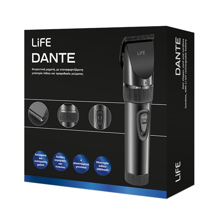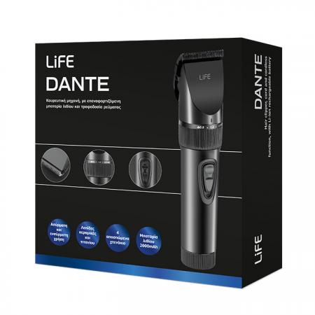 Κουρευτική μηχανή, με επαναφορτιζόμενη μπαταρία λιθίου και τροφοδοσία ρεύματοςΗ κουρευτική μηχανή LiFE Dante είναι σχεδιασμένη για επαγγελματικά αποτελέσματα, αντοχή στον χρόνο και άνεση στη χρήση.Διαθέτει επαναφορτιζόμενη μπαταρία λιθίου χωρητικότητας 2000mAh, αλλά και δυνατότητα τροφοδοσίας μέσω ρεύματος για να σας προσφέρει απόλυτη ευελιξία στο κούρεμα ακόμα κι αν έχετε ξεχάσει να την φορτίσετε. Η λειτουργία Direct-Drive επιτρέπει τη χρήση της μηχανής ακόμη και όταν η μπαταρία είναι πλήρως αποφορτισμένη — απλώς τη συνδέετε στο ρεύμα και συνεχίζετε απρόσκοπτα το κούρεμά σας.Η κινούμενη κεραμική λεπίδα σε συνδυασμό με την σταθερή λεπίδα τιτανίου εξασφαλίζουν ακρίβεια, αντοχή και τέλειο detailing σε κάθε κούρεμα. Το μήκος κοπής ρυθμίζεται με ακρίβεια από 0.8mm έως 2mm με έναν περιστροφικό διακόπτη, ενώ περιλαμβάνονται και τέσσερα αποσπώμενα χτενάκια (3, 6, 9 και 12mm) για ακόμα περισσότερες επιλογές styling.Η εργονομική της λαβή προσφέρει σταθερό κράτημα και άνεση, ακόμα και μετά από πολύωρη χρήση, ενώ με τον κλασικό slide διακόπτη ON/OFF αποφεύγετε τις κατα λάθος ενεργοποιήσεις-απενεργοποιήσεις της συσκευής.Η πλήρης φόρτιση της μπαταρίας διαρκεί περίπου 4 ώρες, ενώ η αυτονομία λειτουργίας φτάνει τις 4-5 ώρες, εξασφαλίζοντας αξιόπιστη απόδοση χωρίς συχνή ανάγκη επαναφόρτισης. Η μπαταρία μπορεί να αντικατασταθεί πολύ εύκολα (η έξτρα μπαταρία διατίθεται ξεχωριστά), ενώ η τροφοδοσία γίνεται μέσω τροφοδοτικού 5V/1A με ισχύ 5W.Στη συσκευασία περιλαμβάνονται επίσης ένα βουρτσάκι καθαρισμού και ειδικό λάδι για τη συντήρηση των λεπίδων. Χαρακτηριστικά:- Λειτουργία Direct-Drive: ακόμα και με πλήρως αποφορτισμένη μπαταρία, μπορείτε να χρησιμοποιήσετε την κουρευτική μηχανή αμέσως μόλις την συνδέσετε στο ρεύμα- Λειτουργεί τόσο με ρεύμα, όσο και με την ενσωματωμένη επαναφορτιζόμενη μπαταρία Li-ion, χωρητικότητας 2000mAh- Κεραμική λεπίδα (κινούμενη) και λεπίδα τιτανίου (σταθερή) για τέλειο detailing και μέγιστη αντοχή - Με 4 αποσπώμενα χτενάκια για ρυθμιζόμενο μήκος κοπής 3, 6, 9, 12mm- Ρυθμιζόμενο μήκος κοπής (0.8mm -2mm)- Εργονομική λαβή- Χρόνος για πλήρη φόρτιση: περ. 4 ώρες- Διάρκεια λειτουργίας της μπαταρίας (με πλήρως φορτισμένη μπαταρία) : περ. 4-5 ώρες- Συμπεριλαμβάνονται βουρτσάκι καθαρισμού και ειδικό λάδι συντήρησης- Η μπαταρία μπορεί να αντικατασταθεί πολύ εύκολα (η εξτρά μπαταρία πωλείται ξεχωριστά)- Τροφοδοσία: 5V, 1A μέσω τροφοδοτικού- Ισχύς: 5W- Διαστάσεις: 4.5 x 4.1 x 18.5cm- 2 χρόνια εγγύηση