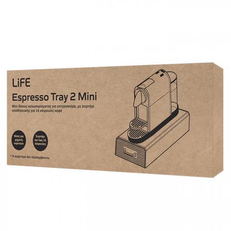Mini δίσκος καλωσορίσματος για εσπρεσσιέρα, με συρτάρι αποθήκευσης για 16 κάψουλες καφέΟ δίσκος καλωσορίσματος για εσπρεσσιέρα με συρτάρι αποθήκευσης LiFE Espresso Tray 2 Mini είναι η ιδανική λύση για μικρούς χώρους και για τους λάτρεις του espresso.Διαθέτει συρτάρι, για να αποθηκεύσετε και να οργανώσετε έως και 16 κάψουλες καφέ Nespresso ή 12 κάψουλες K-cup για τον καθημερινό σας καφέ.Επίσης διαθέτει επιφάνεια 33.8 x 12.8cm, για να τη χρησιμοποιήσετε ως stand και να τοποθετήσετε επάνω τη μηχανή καφέ Nespresso εξοικονομώντας χώρο στην κουζίνα σας.Ο δίσκος καλωσορίσματος LIFE Espresso Tray 2 Mini είναι ιδανικός για δωμάτια ξενοδοχείου, ενοικιαζόμενα και Airbnb.Χαρακτηριστικά:- Stand για μηχανές καφέ Nespresso έως 5Κg- Ιδανικό για εξοικονόμηση χώρου- Χωρητικότητα συρταριού: 16 κάψουλες καφέ Nespresso ή 12 κάψουλες K-cup- Διαστάσεις: 33.8 x 12.8 x 6.1cm- Καθαρό βάρος: 0.43Kg- Υλικό κατασκευής: Πλαστικό (HIPS)- Χρώμα: Μαύρο