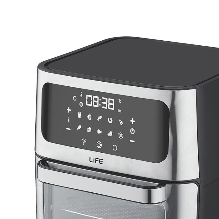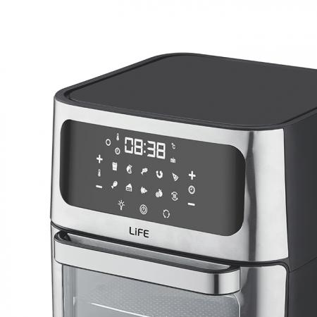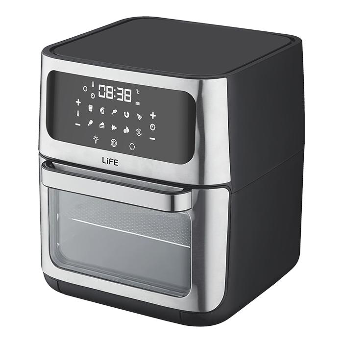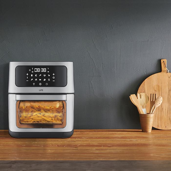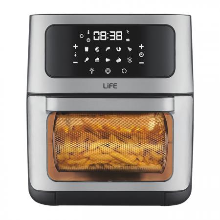 Φριτέζα αέρος 12L, με ψηφιακή οθόνη LED, γυάλινη πόρτα και φωτιζόμενο κάδο, 1800W.Η LiFE Fried Gold σας παρέχει υγιεινό, γρήγορο κι εύκολο μαγείρεμα με ασφάλεια, κι επιπλέον προσφέρει σημαντικά πλεονεκτήματα σε σχέση με τις περισσότερες φριτέζες αέρος της αγοράς λόγω:- Του XXL βαθύ αποσπώμενου κάδου της- Των λειτουργιών που ενσωματώνει- Την πληθώρα των εξαρτημάτων- Του παραθύρου και του εσωτερικού φωτισμού που σας δίνει άμεση θέαση στον κάδο του φαγητού.Με ισχύ 1800W, XXL πλήρως εκμεταλλεύσιμη χωρητικότητα κάδου 12L και λειτουργία ζεστού αέρα για υγιεινό τηγάνισμα με ελάχιστο ή καθόλου λάδι, θα γίνει το απαραίτητο και καθημερινό εργαλείο για τη μαγειρική σας. Η λειτουργία με ζεστό αέρα σας προσφέρει το αποτέλεσμα του τηγανίσματος, χωρίς τη λιπαρότητα και τις θερμίδες του λαδιού.Η LiFE Fried Gold διαθέτει πρακτικό και σύγχρονο σχεδιασμό, με μεγάλη LED οθόνη με πλήκτρα αφής, απ’ όπου μπορείτε να επιλέξετε ένα από τα 9 προ-ρυθμισμένα προγράμματα μαγειρέματος ανάλογα με τον τύπο του γεύματος σας! Μαγειρέψτε το αγαπημένο σας φαγητό χωρίς να ψάχνετε τις ρυθμίσεις που χρειάζονται! Διαθέτει επιπλέον και την πάντα χρήσιμη λειτουργία για ζέσταμα και απόψυξη.Το γυάλινο παράθυρο του κάδου και ο φωτισμός στο εσωτερικό του (διαθέτει πλήκτρο ενεργοποίησης του φωτισμού), σας επιτρέπουν να παρακολουθείτε την πρόοδο του μαγειρέματος, χωρίς να χρειάζεται να ανοίγετε τον κάδο, κάτι το οποίο θα σήμαινε απώλεια θερμότητας και συνεπώς επιμήκυνση του χρόνου μαγειρέματος και υψηλότερη κατανάλωση ενέργειας.Σε περίπτωση που δεν θέλετε να στηριχτείτε στα προ-ρυθμισμένα προγράμματα, αλλά θέλετε να επιλέξετε εσείς τον χρόνο και την θερμοκρασία μαγειρέματος, το μόνο που έχετε να κάνετε είναι να επιλέξετε την απαιτούμενη θερμοκρασία γεύματος (ρυθμιζόμενη θερμοκρασία ψησίματος 40°C - 200°C) και τον απαιτούμενο χρόνο ψησίματος ανάλογα με τον τύπο του γεύματος. Όταν το μαγείρεμα τελειώσει, η LiFE Fried Gold θα τερματίσει αυτόματα τη λειτουργία της και θα σας ειδοποιήσει με ένα ηχητικό σήμα.Ο κάδος χωρητικότητας 12L είναι αποσπώμενος και με αντικολλητική επίστρωση για εύκολο καθάρισμα και διαθέτει θερμομονωμένη λαβή για ασφαλή χειρισμό, Η LiFE Fried Gold έρχεται με μια μεγάλη ποικιλία από χρήσιμα αξεσουάρ, όπως 10 σουβλάκια (ή καλαμάκια - όπως προτιμάει να τα λέει ο καθένας), περιστρεφόμενη σούβλα, κυλινδρικό περιστρεφόμενο καλάθι για τηγανητές πατάτες, δίσκο συλλογής λαδιού, διχτυωτή σχάρα ψησίματος, διάτρητο ταψί ψησίματος και λαβή τοποθέτησης & αφαίρεσης του περιστρεφόμενου καλαθιού και της σούβλας. Όλα αυτά τα αξεσουάρ μπορούν να πλυθούν στο πλυντήριο πιάτων!Τέλος, η LiFE Fried Gold διαθέτει επίσης προστασία υπερθέρμανσης και θερμομονωμένο εξωτερικό περίβλημα για μέγιστη ασφάλεια.Χαρακτηριστικά:- Λειτουργία ζεστού αέρα για υγιεινό τηγάνισμα με ελάχιστο ή καθόλου λάδι- ΧXL βαθύς αποσπώμενος κάδος (ΜxΠxΥ: 244 x 238 x 100 mm) με αντικολλητική επίστρωση και θερμομονωμένη λαβή - Χωρητικότητα: 12L- LED οθόνη με πλήκτρα αφής- 9 προ-ρυθμισμένα προγράμματα μαγειρέματος- Λειτουργία για ζέσταμα και απόψυξη- Παράθυρο για έλεγχο προόδου του μαγειρέματος- Εσωτερικός φωτισμός - Ρυθμιζόμενη θερμοκρασία ψησίματος 40°C - 200°C- Ρυθμιζόμενος χρονοδιακόπτης έως 90 λεπτά με ηχητική ειδοποίηση λήξης- Λειτουργία αυτόματης απενεργοποίησης, όταν ολοκληρωθεί ο χρόνος μαγειρέματος- Προστασία υπερθέρμανσης- Θερμομονωμένο εξωτερικό περίβλημα-