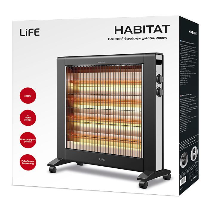 Ηλεκτρική θερμάστρα χαλαζία, 2800WH θερμάστρα χαλαζία LiFE HABITAT αποτελεί την ιδανική επιλογή για οικονομική και αποτελεσματική θέρμανση. Διαθέτει 4 θερμαντικές λάμπες χαλαζία (quartz) για μέγιστη απόδοση και ομοιόμορφη κατανομή της θέρμανσης, με συνολική ισχύ 2800W (700W η κάθε λάμπα) και είναι η ιδανική λύση, για να ζεστάνετε χώρους έως και 40m².Με τον αναλογικό θερμοστάτη που διαθέτει, μπορείτε να διατηρήστε σταθερή τη θερμοκρασία στον χώρο σας, ενώ με τον περιστροφικό διακόπτη επιλογής μεταξύ των 2 συνδυασμών λειτουργίας των θερμαντικών λαμπών (1400W / 2800W), μπορείτε να επιλέξετε το επίπεδο θερμότητας που θέλετε.Η μεταφορά της από δωμάτιο σε δωμάτιο είναι εύκολη χάρη στις πρακτικές, ενσωματωμένες πλαϊνές λαβές, αλλά και στα ροδάκια που διαθέτει, ώστε να την μετακινείτε όπου θέλετε εύκολα και χωρίς κόπο.Τέλος, η LiFE HABITAT αποτελεί μια ασφαλή επιλογή, χάρη στο προστατευτικό πλέγμα μπροστά από τις αντιστάσεις και στον ειδικό διακόπτη ασφαλείας, που απενεργοποιεί αυτόματα την θερμάστρα σε περίπτωση ανατροπής!Χαρακτηριστικά:- 4 θερμαντικές λάμπες χαλαζία (quartz) με ισχύ 700W ανά αντίσταση (συνολική ισχύς 2800W)- Μεγάλη εμβέλεια θέρμανσης και άμεση απόδοση θερμότητας- Ρυθμιζόμενος, αναλογικός θερμοστάτης για επίτευξη σταθερής θερμοκρασίας - Περιστροφικός διακόπτης με 2 συνδυασμούς λειτουργίας αντιστάσεων, 1400W / 2800W- Ειδικός διακόπτης ασφαλείας για αυτόματη απενεργοποίηση σε περίπτωση ανατροπής της συσκευής- Ενσωματωμένες πρακτικές πλαϊνές λαβές για εύκολη και ασφαλή μεταφορά - Περιστρεφόμενα ροδάκια, για εύκολη μετακίνηση- Προστατευτικό πλέγμα στο μπροστινό μέρος για μέγιστη ασφάλεια- Προστασία υπερθέρμανσης- Κατάλληλη για χώρους έως 40m²- Διαστάσεις (ΠxΒxΥ): 58.7 x 28 x 67.1cm (με ροδάκια)- Μήκος καλωδίου: Περίπ. 120cm- Τροφοδοσία: 230V-240V~, 50-60Hz- Ισχύς: 2600-2800W- Καθαρό βάρος: 5.2Kg- Χρώμα: Μαύρο - Ασημί- 2 χρόνια εγγύηση
