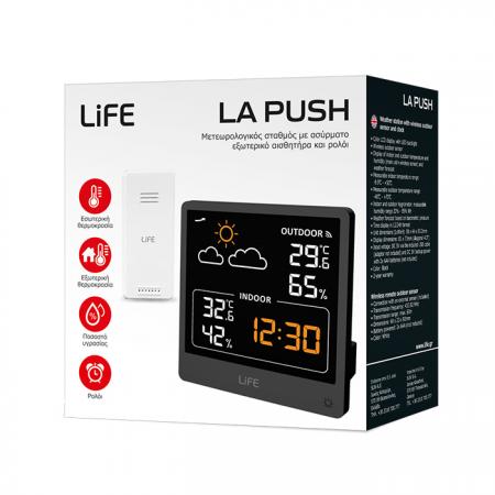 Μετεωρολογικός σταθμός με ασύρματο εξωτερικό αισθητήρα και ρολόιΟ μετεωρολογικός σταθμός LiFE LA PUSH διαθέτει ψηφιακή έγχρωμη LCD οθόνη 4.3", οπίσθιο φωτισμό LED, λειτουργία ρολογιού και ασύρματη εξωτερική μονάδα, ώστε να έχετε πλήρη ενημέρωση των καιρικών συνθηκών στην περιοχή σας!Προβάλλει την θερμοκρασία και υγρασία, τόσο του εσωτερικού όσο και του εξωτερικού χώρου, καθώς και την πρόγνωση του καιρού με 6 διαφορετικά εικονίδια, βάσει της βαρομετρικής πίεσης.Διαθέτει επιπλέον προβολή της ημερήσιας υψηλότερης/χαμηλότερης θερμοκρασίας–υγρασίας, αλλά και προβολή της ώρας σε ψηφιακή μορφή. Η εσωτερική μονάδα λειτουργεί με το συμπεριλαμβανόμενο καλώδιο USB (δεν περιλαμβάνεται τροφοδοτικό), ενώ, για να μην χάνονται οι ρυθμίσεις σας σε περίπτωση διακοπής του ρεύματος, μπορείτε να τοποθετήσετε 2 x ΑΑΑ μπαταρίες ως εφεδρική παροχή.Ο επιτραπέζιας τοποθέτησης μετεωρολογικός σταθμός LiFE LA PUSH έχει συμπαγείς διαστάσεις, καθιστώντας τον ιδανικό για διακριτική τοποθέτηση σε οποιοδήποτε σημείο του σπιτιού σας!Τέλος, όταν τροφοδοτείται από την θύρα USB Type C, μπορείτε να επιλέξετε την ένταση του οπίσθιου φωτισμού με το αντίστοιχο πλήτρο στην όψη του σταθμού.Χαρακτηριστικά:- Έγχρωμη οθόνη LCD με οπίσθιο LED φωτισμό- Ασύρματος εξωτερικός αισθητήρας - Προβολή εσωτερικής κι εξωτερικής θερμοκρασίας και υγρασίας (κύρια μονάδα + εξωτερικού αισθητήρα) και πρόγνωσης καιρού- Εύρος μετρήσιμης εσωτερικής θερμοκρασίας: -9.9°C - +50°C - Εύρος μετρήσιμης εξωτερικής θερμοκρασίας: -40°C - +70°C - Εύρος μετρήσιμης εσωτερικής κι εξωτερικής υγρασίας: 20% - 95% RH- Πρόγνωση καιρού βάσει της βαρομετρικής πίεσης- Εμφάνιση ώρας σε μορφή 12/24h- Διαστάσεις μονάδας(ΜxΠxΥ): 90 x 44 x 93.3mm- Διαστάσεις οθόνης: 81 x 73mm (διαγώνιος 4.3'')- Τροφοδοσία: DC 5V μέσω του συμπεριλαμβανόμενου καλωδίου USB (δεν περιλαμβάνεται τροφοδοτικό) κι εφεδρική παροχή DC 3V με 2x AAA μπαταρίες (δεν συμπεριλαμβάνονται)- Χρώμα: Μαύρο- 2 χρόνια εγγύησηΑσύρματος εξωτερικός αισθητήρας- Σύνδεση με εξωτερικό αισθητήρα (συμπεριλαμβάνεται)- Συχνότητα μετάδοσης: 433.92 MHz- Εμβέλεια μετάδοσης πομπού: max. 60m- Διαστάσεις: 40 x 23 x 92mm- Λειτουργεί με μπαταρίες: 2x AΑA (δεν συμπεριλαμβάνονται)- Χρώμα: Λευκό- Ο κωδικός του εξωτερικού αισθητήρα που είναι συμβατός με τον μετεωρολογικό σταθμό LiFE LA PUSH είναι ο LiFE WSS2 (221-0470).