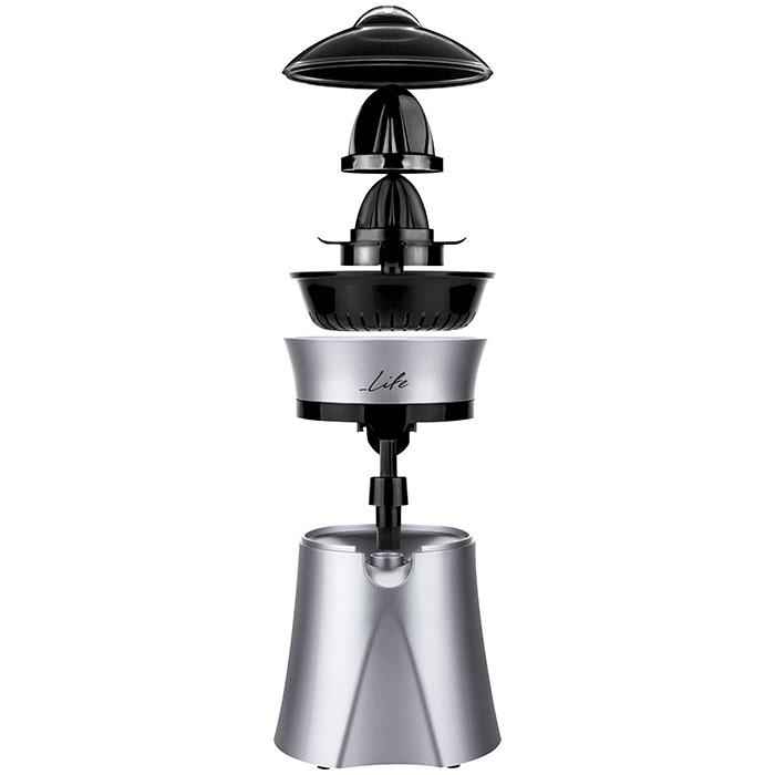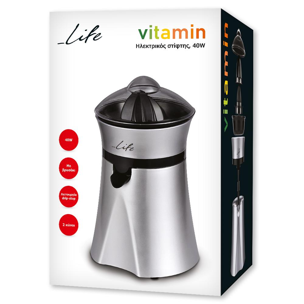 Ηλεκτρικός στίφτης, 40W.Ο LiFE Vitamin της σειράς Silver Matt, προσθέτει πόντους στην αισθητική της κουζίνα σας, με το ιδιαίτερο design του, σε ασημί ματ χρώμα.Ξεκίνα την ημέρα σου με τον πιο υγιεινό τρόπο! Ο ηλεκτρικός στίφτης LiFE Vitamin σου προσφέρει τη δυνατότητα να στύψεις πορτοκάλια, λεμόνια και άλλα μικρά και μεγάλα εσπεριδοειδή άνετα και γρήγορα χάρη στο ισχυρό μοτέρ 40W που διαθέτει.Ο LiFE Vitamin είναι το ιδανικό εργαλείο για κάθε κουζίνα. Διαθέτει 2 εναλλάξιμους κώνους για μικρά και μεγάλα εσπεριδοειδή και αριστερόστροφη / δεξιόστροφη λειτουργία για αποτελεσματικότερο στίψιμο. Επίσης, διαθέτει δοχείο συλλογής υπολειμμάτων που ξεχωρίζει τον πολτό από τον χυμό.Συνεχής ροή!Ο στίφτης διαθέτει στόμιο εξαγωγής χυμού, τύπου βρυσάκι, για να σερβίρεται ο χυμός σας απευθείας στο ποτήρι. Επιπλέον έχει λειτουργία drip-stop για παύση της ροής, ώστε να διατηρείτε την κουζίνα σας πεντακάθαρη! Επιπλέον όλα τα αποσπώμενα εξαρτήματα πλένονται στο πλυντήριο πιάτων!Τέλος, ο LIFE Vitamin διαθέτει βάση με 4 ποδαράκια και παρέχει εξαιρετική σταθερότητα κατά τη χρήση.Συνδυάστε τον στίφτη LiFE Vitamin με τα υπόλοιπα προϊόντα της σειράς LiFE Silver Matt Series για να δώσετε στην κουζίνα σας μια ομοιόμορφη εικόνα premium αισθητικής σε ματ ασημί χρώμα.Χαρακτηριστικά:- Αυτόματη ενεργοποίηση / απενεργοποίηση λειτουργίας με το πάτημα του κώνου- Βρυσάκι για να σερβίρεται απευθείας σε ποτήρι- Λειτουργία drip-stop- Δοχείο συλλογής υπολειμμάτων που ξεχωρίζει τον πολτό από τον χυμό- Όλα τα εξαρτήματα είναι αφαιρούμενα και πλένονται στο πλυντήριο πιάτων- Διαθέτει διαφανές καπάκι για προστασία από τη σκόνη- Συμπεριλαμβάνονται: 2 κώνοι για μικρά και μεγάλα εσπεριδοειδή - Βάση με 4 ποδαράκια, για εξαιρετική σταθερότητα- Τροφοδοσία: 220-240V, 50-60Hz- Ισχύς: 40W- Βάρος: 720g- Χρώμα: Ασημί- 2 χρόνια εγγύηση