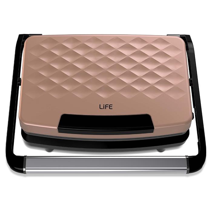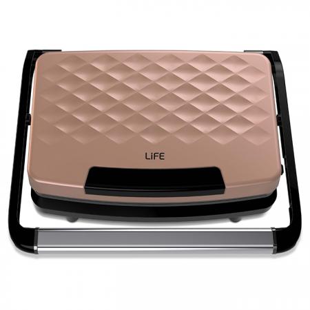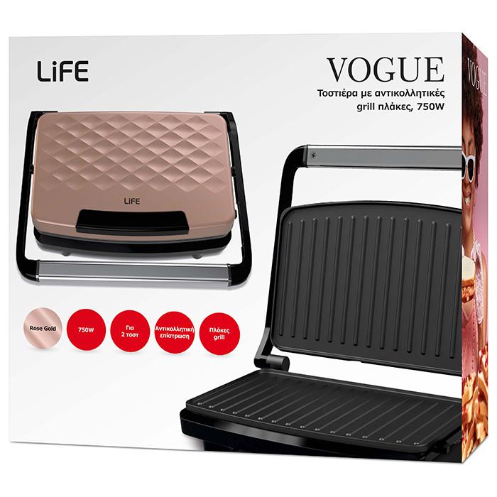Τοστιέρα με αντικολλητικές grill πλάκες, 750W, σε rose gold χρώμα.Η τοστιέρα LIFE VOGUE είναι ένα fashion statement στην κουζίνα σας!Το μοναδικό της design, σε συνδυασμό με το μοναδικό rose gold χρώμα και τα πρακτικά της χαρακτηριστικά, θα της δώσουν μια περίοπτη θέση στην καθημερινότητά σας. Γιατί τα πάντα είναι θέμα στυλ!Διαθέτει grill πλάκες με αντικολλητική επίστρωση, για εύκολο και απλό καθαρισμό, καθώς και αυτόματη προσαρμογή της άνω πλάκας κατά το κλείσιμο, καθιστώντας την ιδανική για το πλέον ομοιόμορφο ψήσιμο, ακόμα και για τοστ από ψωμί φούρνου. Το τοστ θα είναι έτοιμο μέσα σε λίγα μόλις λεπτά χάρη στη γρήγορη θέρμανση των πλακών.Η πρακτική δυνατότητα κάθετης αποθήκευσης σας εξοικονομεί χώρο και την καθιστά ιδανική για κάθε κουζίνα.Χαρακτηριστικά:- Κατάλληλη για 2 τοστ- Grill πλάκες, 23 x 14.5cm- Αντικολλητική επίστρωση για εύκολο καθάρισμα- Σύστημα αυτόματης προσαρμογής της άνω πλάκας κατά το κλείσιμο, για βέλτιστο και ομοιόμορφο ψήσιμο- Ενδεικτική λυχνία λειτουργίας / θερμοκρασίας- Πρακτική και θερμομονωμένη λαβή για ασφαλή χρήση- Έξυπνο τύλιγμα καλωδίου κατά την αποθήκευση, στην βάση της συσκευής- Δυνατότητα κάθετης αποθήκευσης με ασφάλεια κλειδώματος, για εξοικονόμηση χώρου- Τροφοδοσία: 220V-240V, 50/60Hz- Ισχύς: 750W- 2 χρόνια εγγύηση