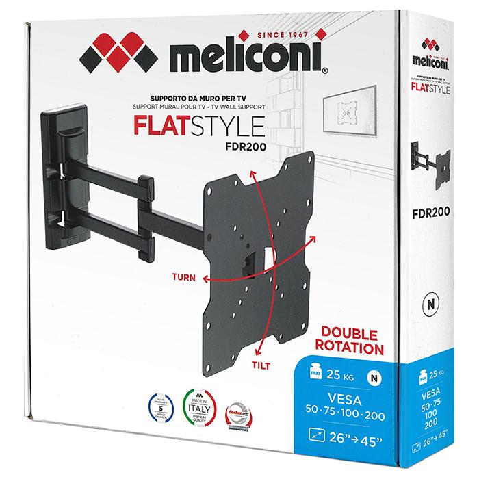 Επιτοίχια βάση στήριξης με 2 βραχίονες, για τηλεοράσεις LED/LCD από 26" έως 45".Η βάση FDR 200 της Meliconi είναι κατάλληλη για όλες τις τηλεοράσεις με VESA 50 - 75 - 100 - 200, και προσφέρει οριζόντια περιστροφή και κάθετη κλίση. - Συμβατό μέγεθος οθόνης: 26" - 45"- VESA (mm): 50 - 75 - 100 - 200- Μέγιστο βάρος τηλεόρασης: 25kg - Οριζόντια περιστροφή: +/- 90°- Κάθετη κλίση: -5° / +20° - Απόσταση από τον τοίχο: min 77 - max 390 mm- Περιλαμβάνονται βίδες, ούπα Fischer και αλφάδι- Made in Italy