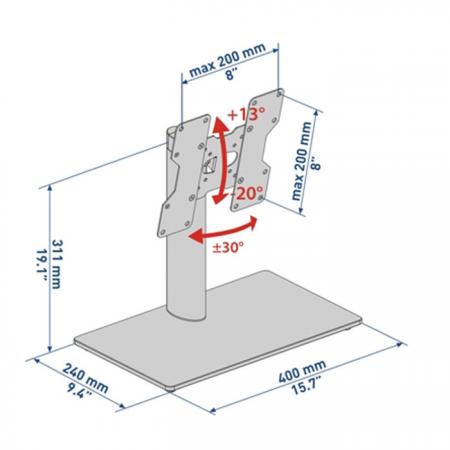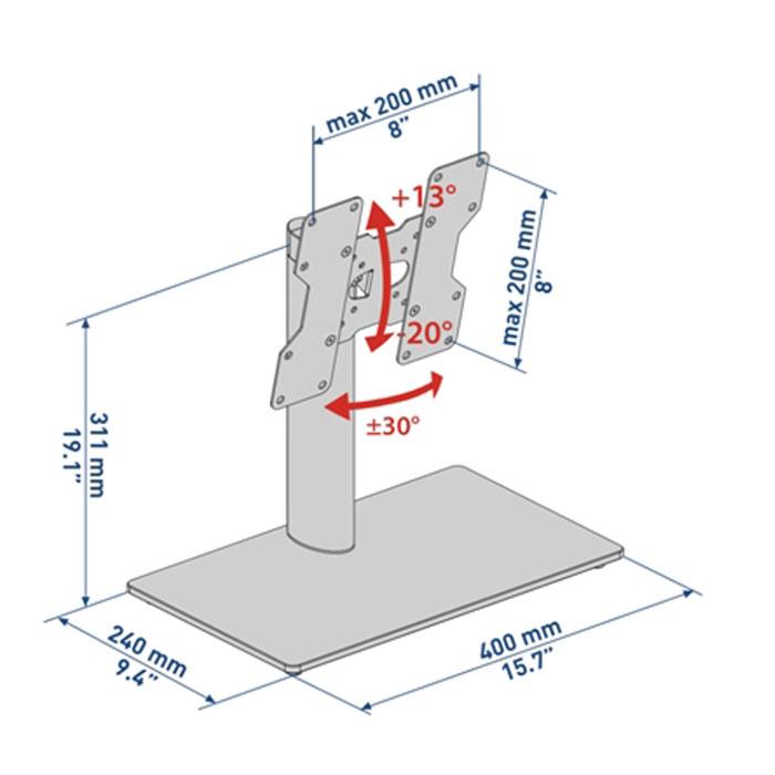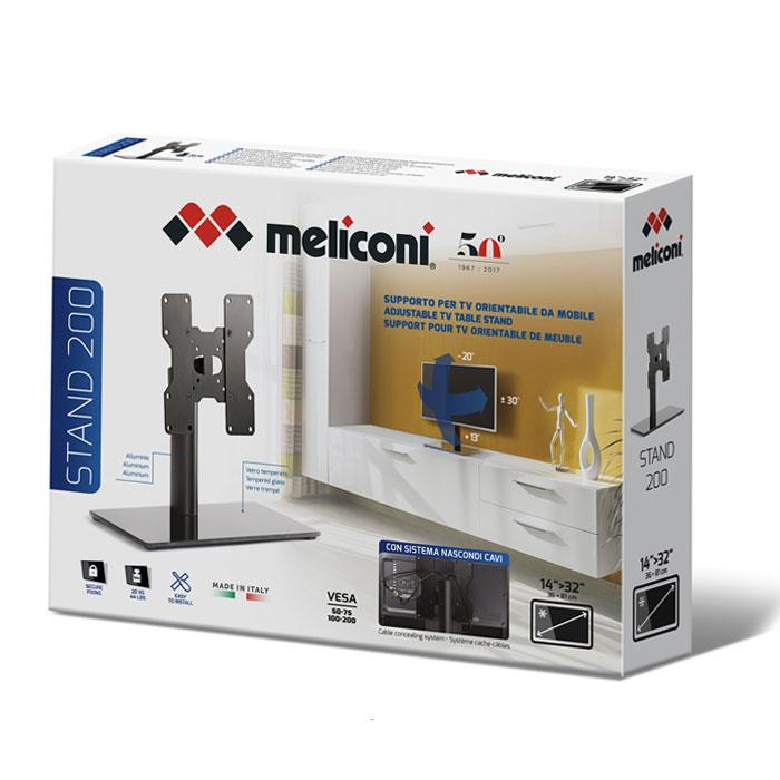 Επιτραπέζια βάση στήριξης για τηλεοράσεις LED/LCD από 14" έως 40". Η επιτραπέζια βάση Meliconi STAND 100-200 είναι ιδανική για τηλεοράσεις με VESA 50-75-100-200 και προσφέρει οριζόντια περιστροφή και κάθετη κλίση. Η κομψή γυάλινη βάση της Meliconi STAND 100-200 εγγυάται σταθερότητα χωρίς να χρειάζεται να τρυπήσετε τον τοίχο, ενώ η κολώνα στήριξης από αλουμίνιο συνδυάζει μοντέρνο σχεδιασμό, εξαιρετική σταθερότητα και εργονομία, καθώς επίσης μπορεί να χρησιμοποιηθεί ως σύστημα κάλυψης καλωδίων της τηλεόρασης αλλά και των συνδεδεμένων A/V συσκευών. Τέλος, η Meliconi STAND 100-200 είναι η ιδανική λύση για την τοποθέτηση των τηλεοράσεων που έχουν τα εργοστασιακά ποδαράκια στήριξης στις άκρες της τηλεόρασης, για τοποθέτηση σε περιορισμένων διαστάσεων έπιπλα. Χαρακτηριστικά: - Εύκολη και γρήγορη συναρμολόγηση - Υλικά κατασκευής: βάση γυαλί / κολώνα αλουμίνιο - Συμβατό μέγεθος οθόνης: 14" - 40" - VESA (mm): 50-75-100-200- Μέγιστο βάρος τηλεόρασης: 20 kg - Οριζόντια περιστροφή: +/- 30° - Κάθετη κλίση: -13° / +20° - Χρώμα: Μαύρο - Made in Italy