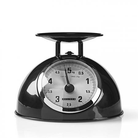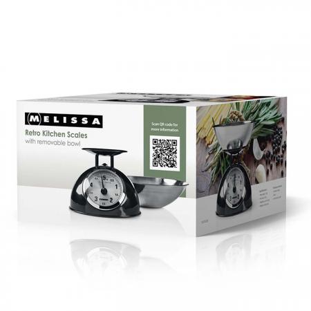 Αναλογική ζυγαριά κουζίνας, τύπου ρετρό, σε μαύρο μεταλλικό χρώμα.Η αναλογική ζυγαριά κουζίνας της Melissa συνδυάζει κομψό ρετρό σχεδιασμό με πρακτική λειτουργικότητα, προσφέροντας ακρίβεια και ευκολία χρήσης σε κάθε κουζίνα. Ο μηχανικός δείκτης με διαβαθμίσεις ανά 25 γραμμάρια εξασφαλίζει ακριβείς μετρήσεις, καθιστώντας την ιδανική για καθημερινό μαγείρεμα και ζαχαροπλαστική.Το αποσπώμενο μπολ από ανοξείδωτο ατσάλι είναι ανθεκτικό σε λεκέδες και οσμές και καθαρίζεται εύκολα, ενώ εφαρμόζει σταθερά στη ζυγαριά κατά τη χρήση.