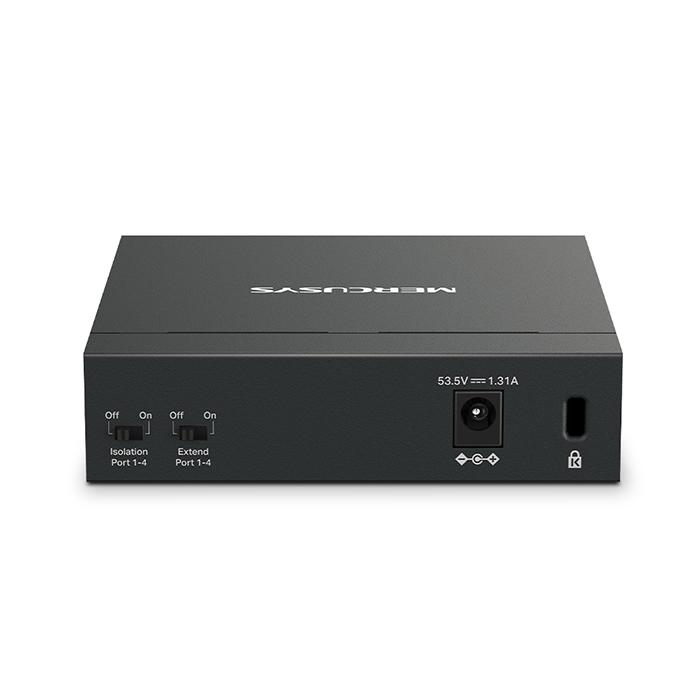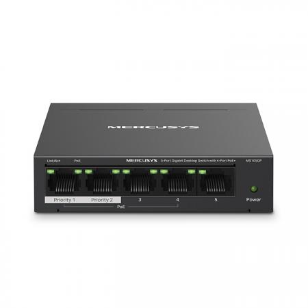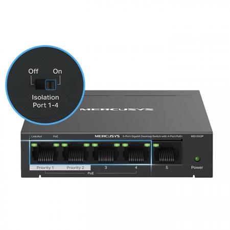 5-Port Gigabit desktop switch με 4 θύρες PoE+Το MS105GP είναι ένα ισχυρό gigabit switch με 4 θύρες PoE+ (Power over Ethernet), ιδανικό για σύγχρονες εγκαταστάσεις όπου η τροφοδοσία και η σύνδεση δικτύου πρέπει να γίνουν εύκολα και αποτελεσματικά. Οι θύρες 1 έως 4 υποστηρίζουν PoE+ σύμφωνα με το πρότυπο IEEE 802.3af/at, παρέχοντας έως 30W ισχύ η καθεμία, με συνολική διαθέσιμη ισχύ 65W. Αυτό το χαρακτηριστικό το καθιστά ιδανικό για την τροφοδοσία IP καμερών, access points, IP τηλεφώνων, καταγραφικών και άλλων συσκευών χωρίς την ανάγκη ξεχωριστών τροφοδοτικών.Πλεονεκτήματα Power over Ethernet (PoE+)- Εύκολη εγκατάσταση: Απλοποιήστε τη δικτυακή υποδομή σας χωρίς επιπλέον καλωδιώσεις ή ηλεκτρολογικές εργασίες.- Οικονομία: Μειώστε τα έξοδα εγκατάστασης και συντήρησης, καθώς το ίδιο καλώδιο μεταφέρει ταυτόχρονα δεδομένα και ισχύ.- Μεγάλη ευελιξία: Τοποθετήστε συσκευές ακόμα και σε δύσκολα προσβάσιμες ή απομακρυσμένες περιοχές.- Προστασία και διαχείριση ισχύος: Το switch διαχειρίζεται έξυπνα την κατανάλωση ενέργειας, προστατεύοντας τις συσκευές από υπερτάσεις και υπερφόρτωση.Λειτουργία extend για μεγαλύτερη εμβέλειαΧάρη στη λειτουργία extend, το MS105GP υποστηρίζει μετάδοση PoE σε αποστάσεις έως και 250 μέτρων, υπερβαίνοντας το συμβατικό όριο των 100 μέτρων. Αυτό το καθιστά ιδανικό για εγκαταστάσεις όπως κάμερες ασφαλείας σε εκτεταμένους χώρους.Ασφάλεια και απόδοση δικτύου- Διαχωρισμός κυκλοφορίας (Traffic Isolation): Με ένα απλό κλικ, η λειτουργία Isolation διαχωρίζει την κυκλοφορία μεταξύ των θυρών, αποτρέποντας παρεμβολές και βελτιώνοντας την ασφάλεια.- Προτεραιοποίηση θυρών (Port Prioritization): Διασφαλίζει την απρόσκοπτη λειτουργία κρίσιμων εφαρμογών, όπως φωνή και βίντεο, δίνοντας προτεραιότητα στα δεδομένα από συγκεκριμένες θύρες.Plug & Play – Εύκολη χρήσηΤο MS105GP υποστηρίζει αυτόματη ανίχνευση ταχύτητας (10/100/1000 Mbps) και MDI/MDIX, επιτρέποντας γρήγορη και απρόσκοπτη σύνδεση χωρίς επιπλέον ρυθμίσεις. Ιδανικό για γρήγορη ανάπτυξη δικτύων χωρίς κόπο.Ανθεκτικός σχεδιασμός & αθόρυβη λειτουργίαΤο μεταλλικό περίβλημα του MS105GP εξασφαλίζει αποτελεσματική απαγωγή θερμότητας, προστασία από ηλεκτρομαγνητικές παρεμβολές και σταθερή λειτουργία, ενώ η αθόρυβη λειτουργία του το καθιστά κατάλληλο για κάθε περιβάλλον, από γραφεία μέχρι επιχειρηματικούς χώρους.Χαρακτηριστικά:- Plug & Play: Έτοιμο για χρήση χωρίς ρυθμίσεις - απλά συνδέστε το στην τροφοδοσία και ξεκινήστε τη λειτουργία- Διαθέτει 5x RJ-45 10/100/1000 Mbp θύρες auto-negotiation με auto MDI / MDIX- Πλήρης υποστήριξη Gigabit: 5 θύρες RJ45 με ταχύτητες 10/100/1000 Mbps, εξασφαλίζοντας γρήγορη και αξιόπιστη μεταφορά δεδομένων- PoE+ σε 4 θύρες: Μεταφορά δεδομένων και τροφοδοσία μέσω ενός μόνο καλωδίου, απλοποιώντας σημαντικά την εγκατάσταση - Υψηλή ισχύς PoE+: Παρέχει έως 30W ανά θύρα, με συνολική ισχύ 65W, ιδανική για την υποστήριξη απαιτητικών συσκευών - Εμβέλεια έως 250 μέτρα: Η λειτουργία extend επιτρέπει τη μετάδοση δεδομένων και ρεύματος σε μεγάλες αποστάσεις χωρίς απώλειες- Λειτουργία Isolation: Απομονώνει την κυκλοφορία ανά θύρα, εξασφαλίζοντας σταθερότητα και αυξημένη ασφάλεια δικτύου- Συμβατότητα με τα πρότυπα IEEE 802.3af/at: Ιδανικό για IP κάμερες, access points και άλλες συσκευές PoE- Ανθεκτική κατασκευή: Μεταλλικό περίβλημα που προσφέρει βέλτιστη ψύξη και μεγαλύτερη διάρκεια ζωής- Συμπαγής σχεδιασμός για ευέλικτη διάταξη- Κατάλληλο για τοποθέτηση σε επίπεδες επιφάνειες (π.χ. σε γραφείο) ή σε τοίχο - Switching Capacity: 10Gbps- Θύρες: 1-4: 4x RJ-45 10/100/1000 Mbps (PoE) & 5: 1x RJ-45 10/100/