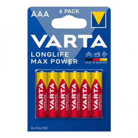 Μπαταρίες Alkaline Varta Longlife Max Power AAA LR03 μεγάλης διάρκειας σε συσκευασία 6 τεμαχίων. Οι μπαταρίες διαθέτουν πιστοποίηση ISO9002 και πληρούν όλες τις προδιαγραφές της Ε.Ε.