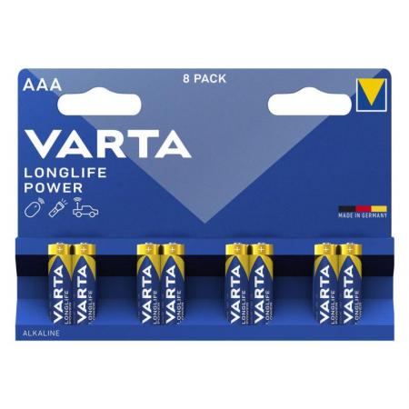 Μπαταρίες Alkaline Varta Longlife Power AAA LR03 μεγάλης διάρκειας σε συσκευασία 8 τεμαxίων. Οι μπαταρίες διαθέτουν πιστοποίηση ISO9002 και πληρούν όλες τις προδιαγραφές της Ε.Ε.
