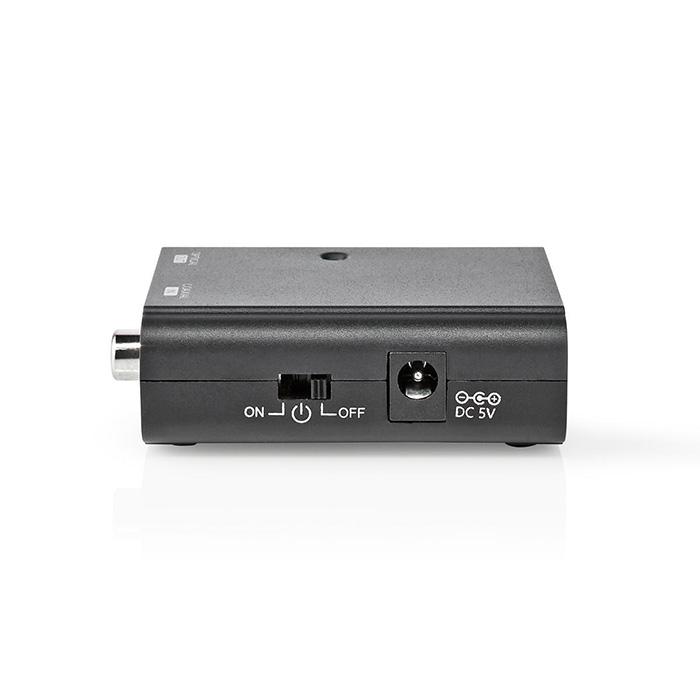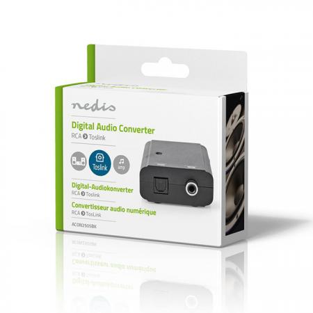 Ψηφιακός μετατροπέας ήχου από S/PDIF (RCA) θηλ. σε TosLink θηλ.Συνδέστε μια συσκευή Blu-ray ή μια κονσόλα παιχνιδιών σε έναν δέκτη ή ενισχυτή. Μετατρέπει το ψηφιακό σήμα ήχου από S/PDIF (RCA) θηλ. σε TosLink.- Είσοδος: 1x S/PDIF (RCA) θηλ.- Έξοδος: 1x TosLink θηλ.Χαρακτηριστικά- Μετατροπή σήματος S/PDIF (RCA) σε TosLink- Συμπαγής σχεδιασμός, για εύκολη εγκατάσταση και χρήση- Ενισχύει το σήμα- Διαθέτει LED ένδειξη ενεργοποίησης- Καλωδίου τροφοδοσίας: 1,80 m- Λειτουργία ελέγχου: Αυτόματα- Κατανάλωση ενέργειας: 1W- Ρεύμα εισόδου: 600mA- Τάση εισόδου: 5 VDC- Υποστηριζόμενες μορφές: DTS, AAC, MPEG-2, PCM, DTS5.1, Dolby Digital, Dolby Digital 5.1- Υλικό κατασκευής: ABS- Διαστάσεις: 84 x 57 x 23 mm- Χρώμα: ΜαύροΠεριεχόμενα συσκευασίας- 1x μετατροπέας ήχου- 1x καλώδιο τροφοδοσίας DC σε USB- Εγχειρίδιο χρήσης
