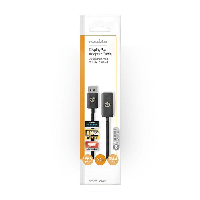 Καλώδιο DisplayPort αρσ. σε HDMI θηλ., 0.20m.Το καλώδιο DisplayPort σε HDMI της Nedis, είναι η ιδανική λύση για τη σύνδεση μιας HDMI 4K120Hz οθόνης με ένα laptop, επιτραπέζιο υπολογιστή ή κάρτα γραφικών με DisplayPort 1.4 ή οποιαδήποτε άλλη συσκευή που δεν διαθέτει τις νέες προδιαγραφές HDMI 4K120Hz.Με την τεχνολογία συμπίεσης βίντεο DisplayPort 1.4, μπορείτε να μετατρέπετε σήματα βίντεο DP1.4 σε σήματα HDMI, υποστηρίζοντας αναλύσεις οθόνης έως 8K (7680 x 4320) @30Hz με HDR.Χαρακτηριστικά:- Υποστηριζόμενες τεχνολογίες: DisplayPort 1.4, HDMI 8K@30Hz- Υποστήριξη Dynamic HDR 10+- Προδιαγραφές HDCP 1.4 & HDCP 2.3- HPD- Αποκωδικοποιητής DSC 1.1/1.2a- Έξοδος βάθους χρώματος 8/10/12 bit- Έξοδος ήχου 1 έως 32 καναλιών LPCM 192 kHz- Ήχος HBR έως 1536 kHz- Πρότυπο ανάλυσης: 8K UHD- Σύνδεση 1: DisplayPort αρσ.- Σύνδεση 2: HDMI θηλ.- Τεχνολογία: DisplayPort 1.4- Μήκος καλωδίου: 0,20m- Μέγιστη ανάλυση: 8K @ 30Hz- AWG: 32- Υλικό αγωγού: Χαλκός - Εξωτερικό υλικό: PVC- Επιμετάλλωση: Νικέλιο- Χρώμα: Μαύρο- Συσκευασία: Paperbag with hook