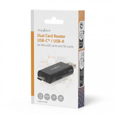 Card Reader USB High Speed με διπλή σύνδεση Type-A & Type-C.Η συσκευή ανάγνωσης καρτών της Nedis προσφέρει υψηλή απόδοση και ευελιξία στη μεταφορά αρχείων, και μπορεί να συνδεθεί τόσο σε θύρες USB-C όσο και USB-A για ευρεία συμβατότητα με όλες τις σύγχρονες και παλαιότερες συσκευές. Υποστηρίζει τις κάρτες μνήμης SD, SDHC, SDXC, Micro SD, Micro SDHC και Micro SDXC, καλύπτοντας έτσι κάθε ανάγκη αποθήκευσης.Η λειτουργία plug and play εξασφαλίζει άμεση σύνδεση, ενώ ο συμπαγής και ανθεκτικός σχεδιασμός με προστατευτικά καλύμματα, διασφαλίζει μακροχρόνια αξιοπιστία και προστασία από σκόνη και φθορές, καθιστώντας τον ιδανικό για επαγγελματική χρήση εν κινήσει.Χαρακτηριστικά:- Plug and Play λειτουργία – δεν απαιτείται η εγκατάσταση drivers- Διπλό βύσμα σύνδεσης σε συσκευές: USB-C & USB-A (USB High Speed) - Μεταφορά και κοινή χρήση δεδομένων - Συμπαγές περίβλημα με προστατευτικά καπάκια για τις θύρες- Δυνατότητα σύνδεσης με laptop, tablet ή smartphone μέσω USB-C ή USB-A- Υποστηριζόμενοι τύποι καρτών μνήμης: microSD (TF), microSDHC (TF), microSDXC (TF), SD, SDHC, SDXC- Ανάγνωση συνδεδεμένων καρτών με μέγιστη χωρητικότητα 500GΒ- Ταχύτητα μεταφοράς δεδομένων έως 480 Mbps- Συμβατό με τα λειτουργικά συστήματα: Windows 8, Windows 10, Windows 11- Τροφοδοσία μέσω USB- Τάση εισόδου: 5 VDC- Ρεύμα εισόδου: 1.0 A- Διαστάσεις: 72 x 24 x 10 mm- Υλικό: ABS / Μέταλλο- Χρώμα: Μαύρο