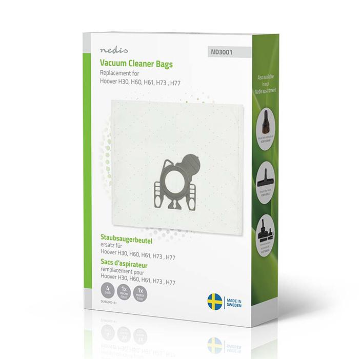 Συνθετικές σακούλες για ηλεκτρικές σκούπες Hoover H60 / H61 / H73 / H77, 4τμχ.Αναβαθμίστε τον καθαρισμό του σπιτιού σας με τις premium συνθετικές σακούλες ηλεκτρικής σκούπας, σχεδιασμένες για μέγιστη απόδοση και υγιεινό αέρα. Με προηγμένη φίλτρανση HEPA που συγκρατεί αποτελεσματικά σκόνη, γύρη και αλλεργιογόνα, αποτελούν την ιδανική επιλογή για οικογένειες με παιδιά, κατοικίδια και άτομα με αλλεργίες.Η βελτιστοποιημένη ροή αέρα διατηρεί την ισχύ αναρρόφησης ακόμα και όταν η σακούλα γεμίζει, εξασφαλίζοντας βαθύ και συνεχή καθαρισμό κάθε φορά. Ο έξυπνος και ασφαλής μηχανισμός κλεισίματος εξαλείφει τη διαρροή σκόνης κατά την αλλαγή, προσφέροντας καθαρή και υγιεινή χρήση χωρίς ακαταστασία.Κατασκευασμένες στη Σουηδία με σεβασμό στο περιβάλλον, οι σακούλες μειώνουν έως και 100% την ενεργειακή κατανάλωση σε σύγκριση με τις παραδοσιακές, παρέχοντας μια ανθεκτική, οικονομική και οικολογική λύση.Χαρακτηριστικά:- Ανταλλακτικές συνθετικές σακούλες ηλεκτρικής σκούπας για Hoover H30, H60, H61, H73, H77- Περιλαμβάνει 4 σακούλες, 1 μικροφίλτρο και 1 φίλτρο μοτέρ για ολοκληρωμένη φροντίδα και απόδοση- Υψηλής απόδοσης φίλτρανση HEPA που παγιδεύει αποτελεσματικά τη σκόνη και τα αλλεργιογόνα — ιδανικό για νοικοκυριά με αλλεργίες και ευαισθησίες- Βελτιστοποιημένη ροή αέρα που εξασφαλίζει ισχυρή αναρρόφηση, αποδοτικό γέμισμα σακούλας και μεγάλη αντοχή- Μηχανισμός ασφαλούς κλεισίματος που εμποδίζει τη διαρροή σκόνης κατά την αλλαγή σακούλας, για καθαρή χρήση- 100% κατασκευασμένες στη Σουηδία- Χρώμα: Λευκό- Συσκευασία: ΚουτίΠεριεχόμενα συσκευασίας:- 4x σακούλες για σκούπα- 1x Micro filter- 1x Motor filter