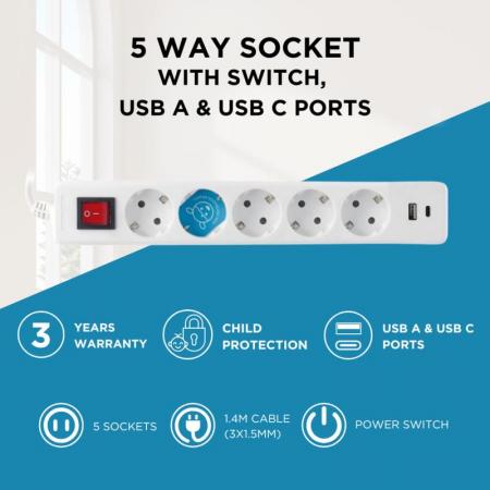 Το πολύμπριζο GSC διαθέτει πέντε υποδοχές για βύσματα suko, ενσωματωμένο διακόπτη on/off και θύρες USB A & USB C. Προσφέρει μέγιστη ισχύ 3680W ανά υποδοχή (συνολικά 3 υποδοχές), με μέγιστο ρεύμα 16Α και υποδοχές για φις 2P+TT πλαϊνό. Το πολύμπριζο διαθέτει παιδική προστασία.