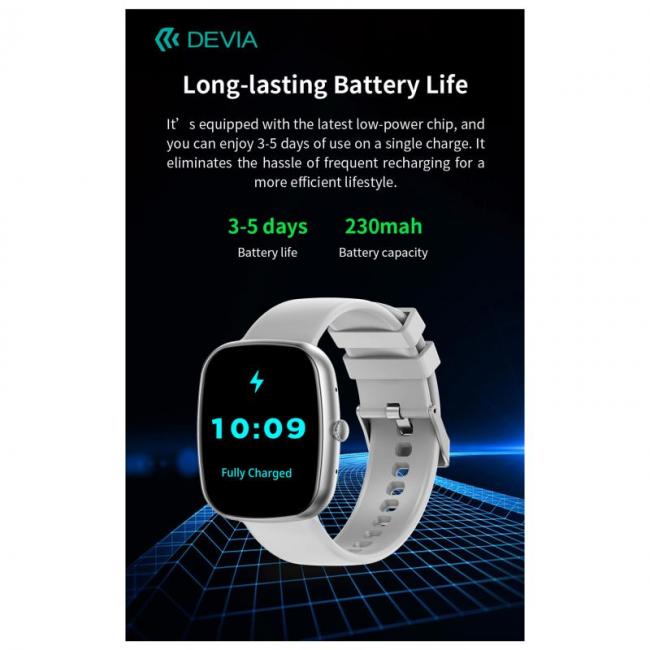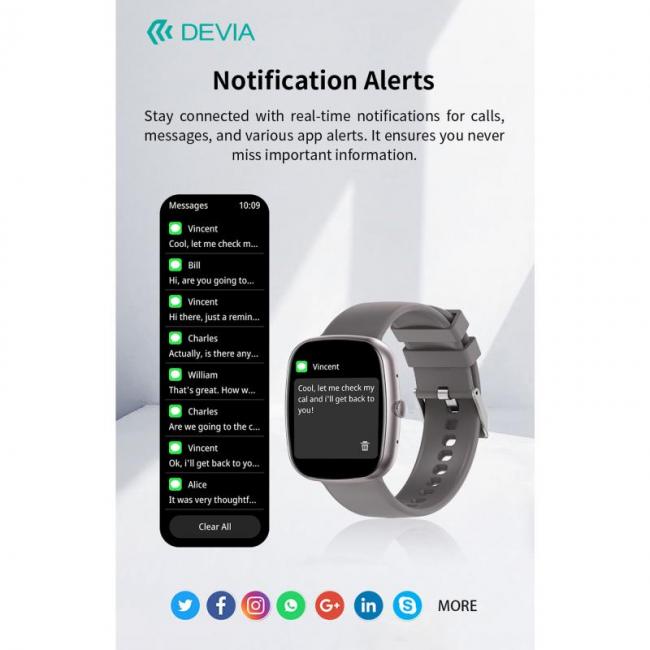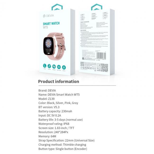 Το Devia WT5 είναι ένα κομψό και πρακτικό smartwatch με ζωντανή οθόνη αφής, ειδοποιήσεις σε πραγματικό χρόνο και λειτουργίες παρακολούθησης υγείας όπως καρδιακός ρυθμός, δραστηριότητα και ύπνος. Με αντοχή στο νερό IP68 και εύκολη σύνδεση μέσω Bluetooth, ταιριάζει σε καθημερινή χρήση, προσφέροντας στυλ και αξιοπιστία.