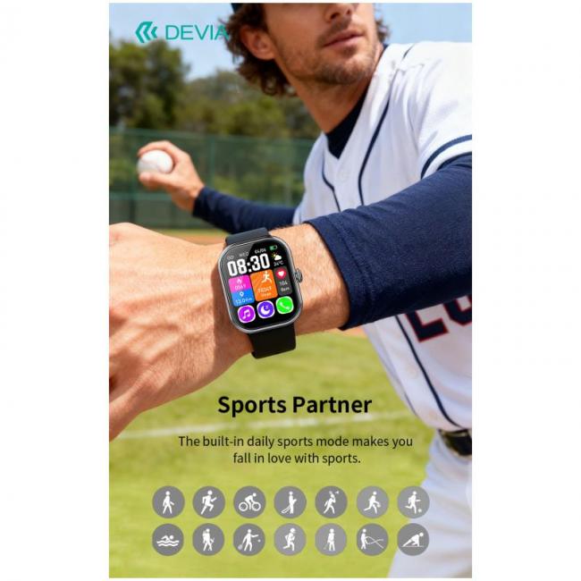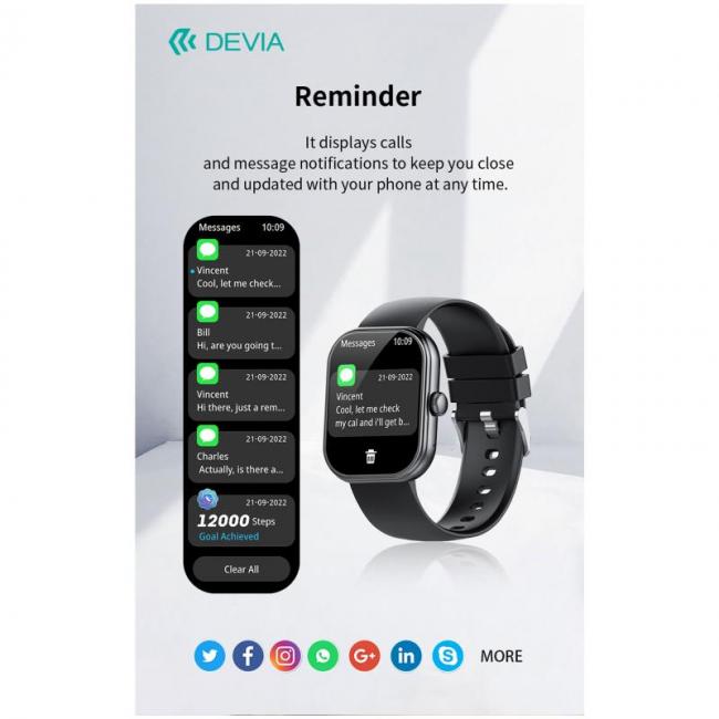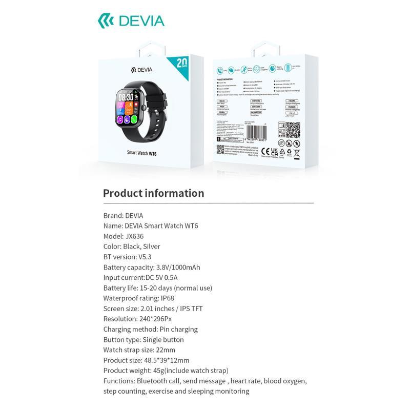 Το Devia WT6 Smartwatch είναι σχεδιασμένο για καθημερινή ευκολία και αξιόπιστη παρακολούθηση της υγείας. Διαθέτοντας οθόνη αφής με ζωηρά χρώματα, προσφέρει ειδοποιήσεις κλήσεων, μηνυμάτων, πολλαπλών λειτουργιών γυμναστικής, καρδιακού ρυθμού και ύπνου σε πραγματικό χρόνο. Με αντοχή στο νερό IP68, χωρητικότητα μπαταρίας 1000mAh & αυτονομία έως και 20 μέρες, είναι ιδανικό για ενεργό τρόπο ζωής.