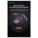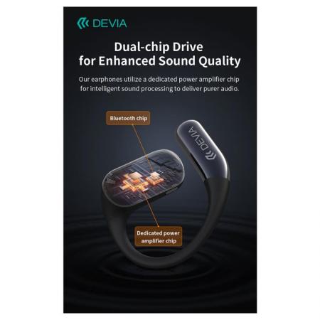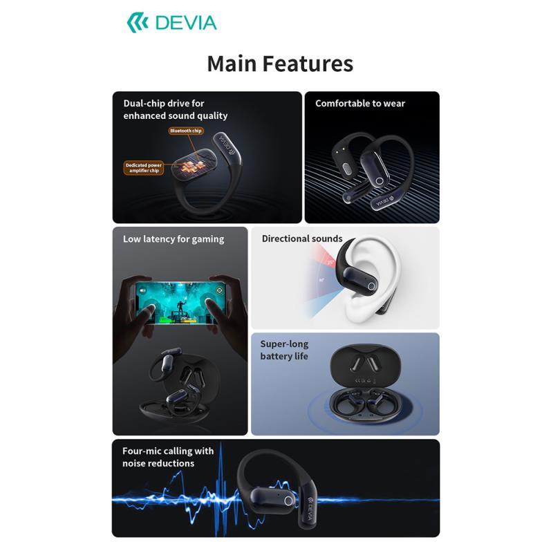 Τα ακουστικά Devia OWS Ultra1 προσφέρουν εξαιρετική απόδοση ήχου με συνδεσιμότητα Bluetooth 5.3, υποστηρίζοντας αποκωδικοποίηση SBC και AAC για καθαρό ήχο. Παρέχει έως και 6 ώρες αναπαραγωγής σε μεσαία ένταση, ενώ η θήκη φόρτισης USB C επιτρέπει 2-3 πλήρεις φορτίσεις, εξασφαλίζοντας εκτεταμένη χρήση. Σχεδιασμένο για άνεση, το στυλ του με άγκιστρο στο αυτί εξασφαλίζει ασφαλή εφαρμογή, καθιστώντας το ιδανικό για ενεργό τρόπο ζωής. Διαθέτει τέσσερα μικρόφωνα μείωσης θορύβου, βελτιώνει την ποιότητα των κλήσεων και περιλαμβάνει ειδική λειτουργία gaming για απόδοση χαμηλής καθυστέρησης. Με ασύρματη εμβέλεια 15 μέτρων και γρήγορη φόρτιση μέσω DC 5V 0,5A, αποτελεί ιδανική επιλογή για απρόσκοπτη μουσική, κλήσεις και παιχνίδια.