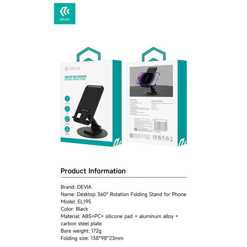 Η αναδιπλούμενη επιτραπέζια βάση στήριξης Devia EL195 είναι μια ευέλικτη και συμπαγής βάση στήριξης για tablet και smartphones. Σχεδιασμένο με δυνατότητα περιστροφής 360°, σας επιτρέπει να προσαρμόσετε τη συσκευή σας στην ιδανική γωνία για άνετη προβολή, είτε εργάζεστε, είτε κάνετε βιντεοκλήσεις, είτε παρακολουθείτε ταινίες. Κατασκευασμένο από ανθεκτικά υλικά, παρέχει σταθερότητα για συσκευές διαφόρων μεγεθών, ενώ τις προστατεύει από γρατζουνιές με μαλακά, αντιολισθητικά μαξιλαράκια. Ο πτυσσόμενος σχεδιασμός του διευκολύνει τη μεταφορά και την αποθήκευση, καθιστώντας το ένα βολικό αξεσουάρ τόσο για χρήση στο σπίτι όσο και στο γραφείο.