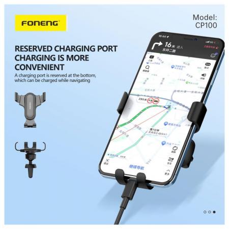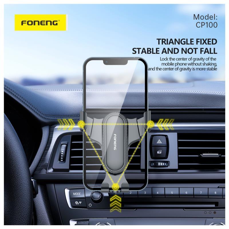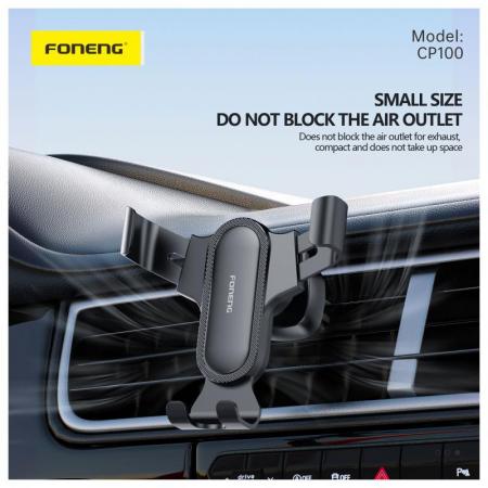 Η βάση στήριξης Foneng CP100 Gravity για αυτοκίνητο είναι κατασκευασμένη από συμπαγές, ανθεκτικό πλαστικό σε κομψό μαύρο χρώμα. Συνδέεται με ασφάλεια στον αεραγωγό του αυτοκινήτου σας χρησιμοποιώντας ένα σύστημα κλιπ και υποστηρίζει πάνω από το 99% των μοντέλων κινητών τηλεφώνων. Με λειτουργία με το ένα χέρι και δυνατότητα περιστροφής 360°, έχετε ευέλικτες γωνίες θέασης και γρήγορη, σταθερή πρόσβαση στο τηλέφωνό σας ενώ οδηγείτε.