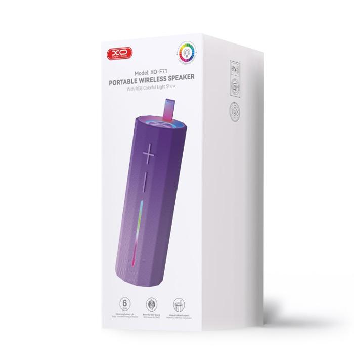 Φορητό bluetooth ηχείο σε μωβ χρώμαΧαρακτηριστικά:- Διαθέτει θύρα TF, κατάλληλη για την τοποθέτηση microSD κάρτας- Λειτουργία Bluetooth- Έκδοση Bluetooth: 5.4- Εύρος σήματος bluetooth: 10 m- Εύρος συχνοτήτων Bluetooth: 2.402-2.480GHz- Διάρκεια μπαταρίας: 5 ώρες (με ένταση 50%)- Πολλαπλά προγράμματα δυναμικών φωτισμών RGB LED- Αδιάβροχο με rating IPX5- Διάμετρος ηχείου: 40mm- 1x είσοδος USB-C- Τροφοδοσία: DC 5V/1A- Ισχύς: 2 x 5W- Ενεργειακή πυκνότητα: 6.6Wh- Ευαισθησία: -80dBm- Λειτουργεί με επαναφορτιζόμενη μπαταρία λιθίου 18650 1800mAh/3.7V- Πλήρης φόρτιση σε 5 ώρες- Διαστάσεις: 76 x 74 x 200mm- Υλικό: ABS, PC, Μέταλλο- Βάρος: 105g- Χρώμα: ΜωβΠεριεχόμενα συσκευασίας:- Ηχείο- Καλώδιο φόρτισης USB-A σε USB-C